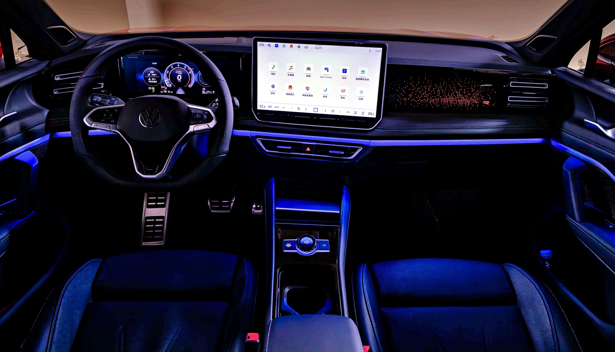 車室以高光澤飾板結合車室氛圍燈環繞,副駕前方可看到車型名稱Tiguan或是R-Line專屬標誌氛圍燈,可隨意設定多重模式如慵懶、愉悅、探索、熱情、寧靜、個人化,依模式不同,氛圍燈、音量、儀表板介面也將連動變更,輕鬆在夜行中打造個人專屬風格。整體設計不僅提升操作直覺性與使用便利性,更讓車主與乘客在每一段旅程中皆能享有先進科技所帶來的便捷與愉悅。
