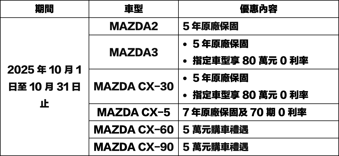 同時,深受市場青睞的熱銷休旅 MAZDA CX-5 自 10 月起限時推出「70 期購車 0 利率」,並搭配業界罕見的「7 年原廠保固」,讓喜愛日系進口車的消費者能同時享有彈性的財務規劃與長期擁車的安心守護,滿足消費者對進口休旅的多元期待。104.9 萬元起的入主門檻搭配舊換新最高 10 萬元貨物稅減徵,MAZDA CX-5 以前瞻產品力傲視同級,標配真皮座椅搭配雙前座導流式通風功能,結合 BOSE® 高階環繞音響輔以高靜謐性 NVH 車艙工程、具 5 種視角模式的 360° 環景輔助及 Hands-free 感應式電動尾門,憑藉契合市場需求的豐富車載配置,MAZDA CX-5 以誠意十足的加乘獻禮與極具競爭力的擁車價值,為競爭激烈的休旅市場注入獨到的日系駕馭美學。 自限時推出旗艦休旅 MAZDA CX-60 與 CX-90「5 萬元購車禮遇」的旗艦臻享專案,到熱銷主力 MAZDA CX-5「70 期購車 0 利率」與「7 年原廠保固」的雙重優惠,台灣馬自達以貼心周全的購車禮遇與原廠守護的長久安心,全面呼應消費者所需,讓每一位準車主都能自在擁抱專屬於自己的駕馭篇章。