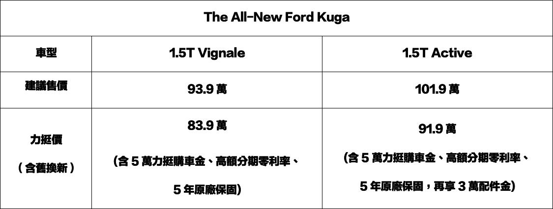 福特六和加碼響應政府貨物稅減徵政策,期間入主The All-New Ford Kuga 1.5T指定車型享力挺價83.9萬起(含舊換新),方案包含5萬元力挺購車金、高額分期零利率及5年原廠保固 ,1.5T Active指定車型再加贈3萬元配件金,福特六和持續刺激消費買氣,搶先釋出國產休旅購車利多.....