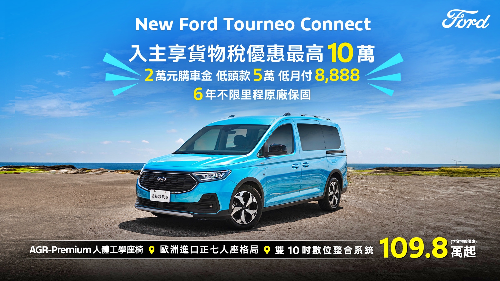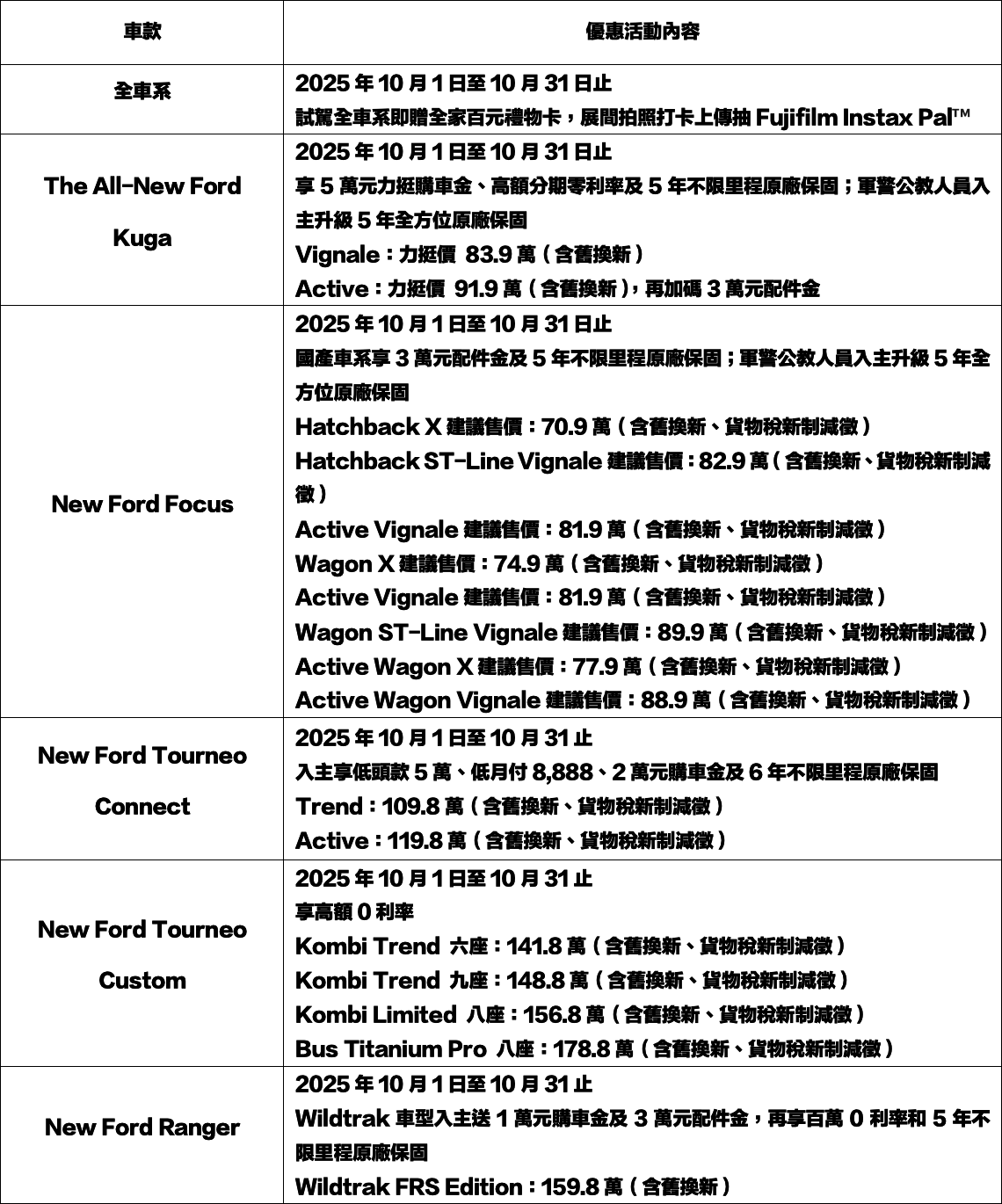 New Ford Focus擁有旅行車、五門掀背與跨界休旅等豐富車型,並以根植於骨的德規駕馭樂趣滿足消費者多元需求,期間入主享貨物稅優惠價70.9萬起,再享3萬元配件金及5年原廠保固;兼具大空間彈性機能與舒適安全的歐洲進口正七人座 MPV New Ford Tourneo Connect福特旅玩家享貨物稅優惠價109.8萬起,再享低頭款5萬、低月付8,888、2萬元購車金及6年原廠保固 ;憑藉其多元化的車型陣容、先進科技配備及靈活空間機能,深受全球市場肯定的歐洲首選國際商旅New Ford Tourneo Custom福特旅行家享貨物稅優惠價141.8萬元起,入主再享高額零利率;進口運動皮卡銷售冠軍New Ford Ranger Wildtrak FRS Edition則享最高12萬優惠,含1萬元購車金、3萬元配件金及5年原廠保固,再加碼百萬0利率購車優惠。此外,福特六和力挺辛勞的軍警及公教人員,入主New Ford Focus國產車型、The All-New Ford Kuga可再升級為5年全方位保固方案 ,敬請把握機會,輕鬆入主Ford好車。