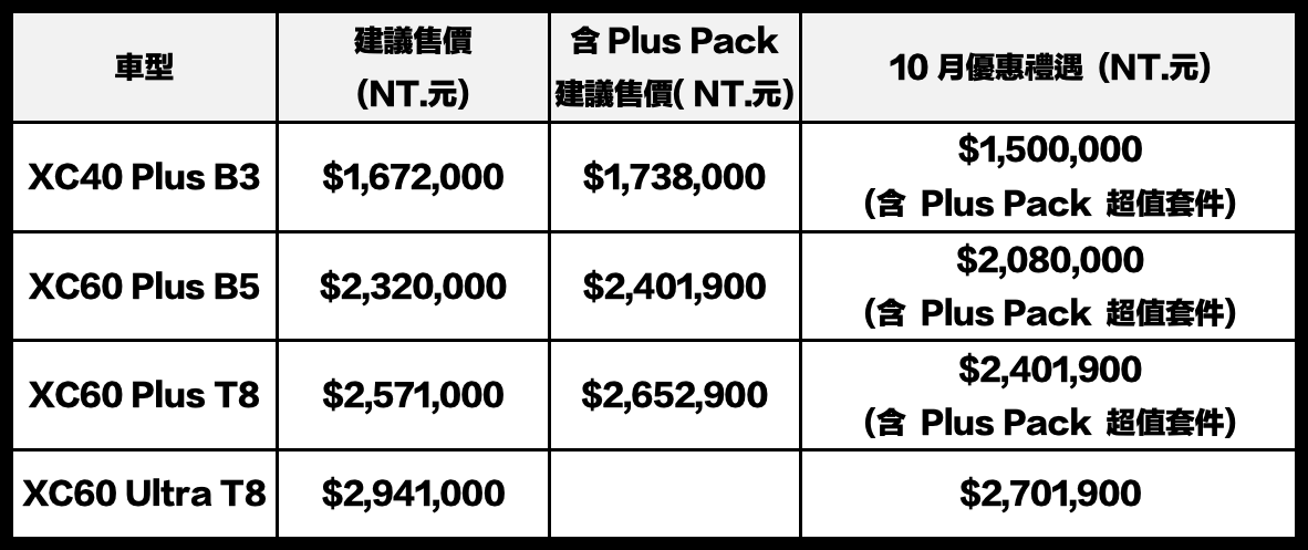 - VOLVO國際富豪汽車為感謝台灣消費者的支持,響應政府貨物稅優惠與車輛舊換新政策, 加碼推出10月尊享購車禮遇,最佳城市休旅Volvo XC40本月優惠價150萬元起,輕奢品味北歐美學生活即刻啟程。