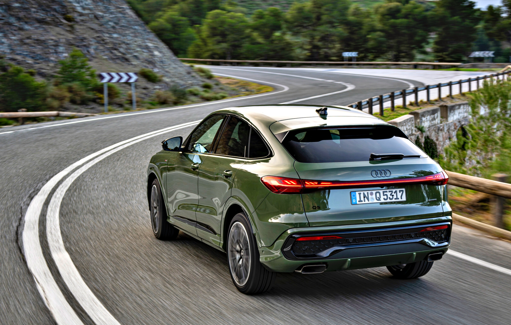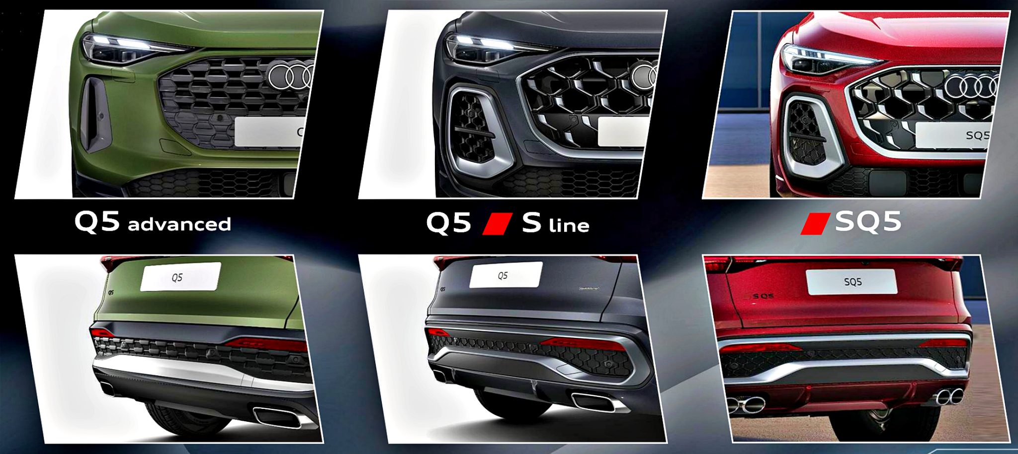 OLED 2.0尾燈與全新投射式第三煞車燈。車身方面,Q5標準SUV版本與塑造更低趴感的Sportback轎跑SUV版本皆有,且僅在行李廂空間相差不到1%,此設定迎合不同市場消費者對於運動風及空間實用的雙重需求。胎圈尺寸多變,提供19至21吋多重選擇,顏色則跳脫千篇一律的灰色系,帶來Grenadine紅、Navarra藍、District綠等個性化色彩配置,外觀趣味與豪華感兼具。