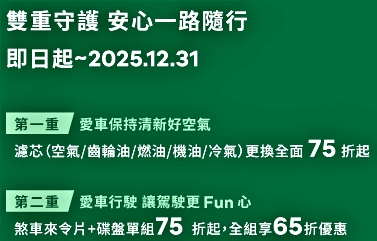 - 煞車來令片+碟盤單組75折起,全組再享65折優惠