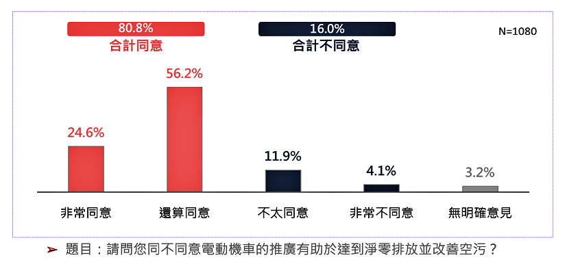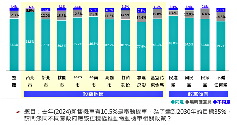 在政府推動運具電動化的政策積極度上,超過半數(50.6%)民眾認為中央政府不夠積極,其中更有高達六成的現有電動機車騎士表達不滿;地方政府的表現亦未能獲得好評,48.9% 民眾指出地方推廣力道不足。負責執行本次民調的山水民意研究股份有限公司總經理 何麗萍 認為:「民調結果顯示,全民高度認同推廣電動機車有助淨零減碳,但『政策作為』與『民意期待』間存在明顯落差,因此有高達 83.3% 的民眾呼籲希望中央政府更積極推動運具電動化政策,並展現出不分縣市、跨世代、跨黨派立場的全民共識,呼應社會大眾對運具轉型的迫切期待。」