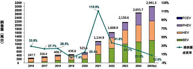 全球電動車銷量與各類車型占比。2025年上半年受美國25%關稅影響,台灣汽車零組件出口短期波動,第一季提前拉貨達341億元,第二季回落至311億元,隨庫存調整,預期第四季可逐步回升。全球車用電子市場2024年規模約3,250億美元,雖成長放緩,仍預估2030年將突破4,500億美元。台灣車電業受電動化與智慧化帶動,在車載顯示、ADAS感測與功率模組等領域快速成長,並朝系統整合方向前進。