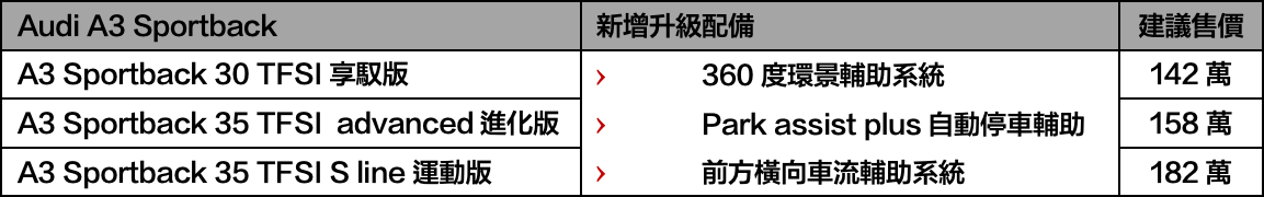 秉持「Vorsprung durch Technik」品牌精神,台灣奧迪持續以創新科技深化豪華駕馭體驗。作為四環家族最具代表性的都會掀背車款,Audi A3 Sportback 長年以俐落比例、靈活機能,成為年輕世代邁入豪華級距的首選。即日起2026 年式 Audi A3 Sportback全車系導入更完整的都會駕駛輔助科技,新增前方橫向車流輔助系統、Park assist plus 自動停車輔助系統與 360 度環景輔助系統,提供 30 TFSI 享馭版、35 TFSI advanced 進化版與 35 TFSI S line 運動版三款編成,建議售價分別為 142 萬元、158 萬元與 182 萬元。台灣奧迪總裁安薩瑞 (Rahil Ansari) 表示:「Audi A3 Sportback許多消費者加入Audi Family的第一步。2026 年式導入多項進化的安全與駕駛輔助科技,持續為消費者帶來不斷進化的行車體驗。」