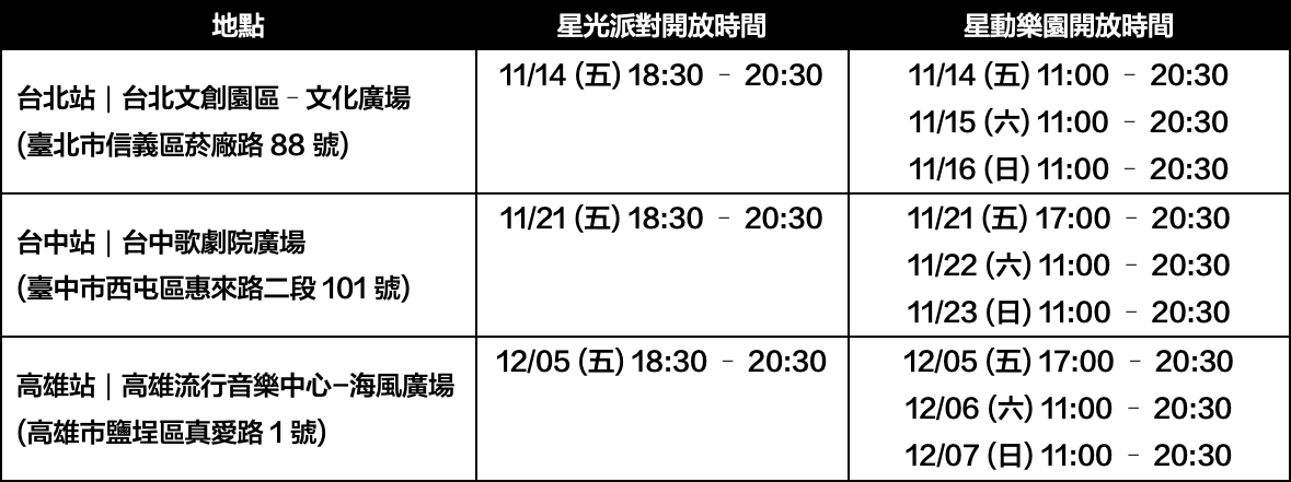 Mercedes-Benz 以滿滿誠意回饋粉絲,只要現場加入台灣賓士官方社群,即可免費入場參加星光派對,與金曲級樂團近距離同樂。台北站 11/14 (五) 由金曲獎最佳樂團「宇宙人」打響首站序幕;台中站 11/21(五)由入圍金曲獎的「鳳小岳」&「壓克力柿子」帶來搖滾能量;高雄站 12/5(五)由剛結束小巨蛋演唱會的人氣樂團「理想混蛋」壓軸登場,三組樂團將帶來多首熱門歌曲,讓粉絲們大飽耳福,與 Mercedes-Benz 一同度過難忘的星光派對。除樂團表演外,更設有限定美食攤位,如現烤雞蛋糕以及手作體驗區,讓參與者們感受 Mercedes-Benz 對粉絲的熱情款待。想參加? 還不趕快追蹤台灣賓士官方社群平台,獲得星光派對入園資格:https://mbtw.me/GCy3。