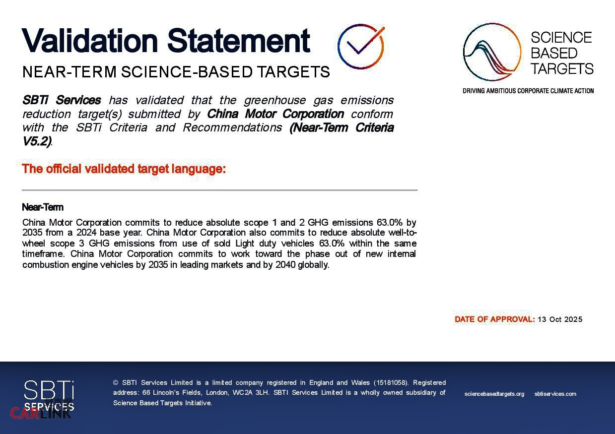 中華汽車之目標已於 2025 年 10 月通過 SBTi 驗證,並登錄於 SBTi 官方網站之 Target Dashboard(sciencebasedtargets.org/companies-taking-action)。