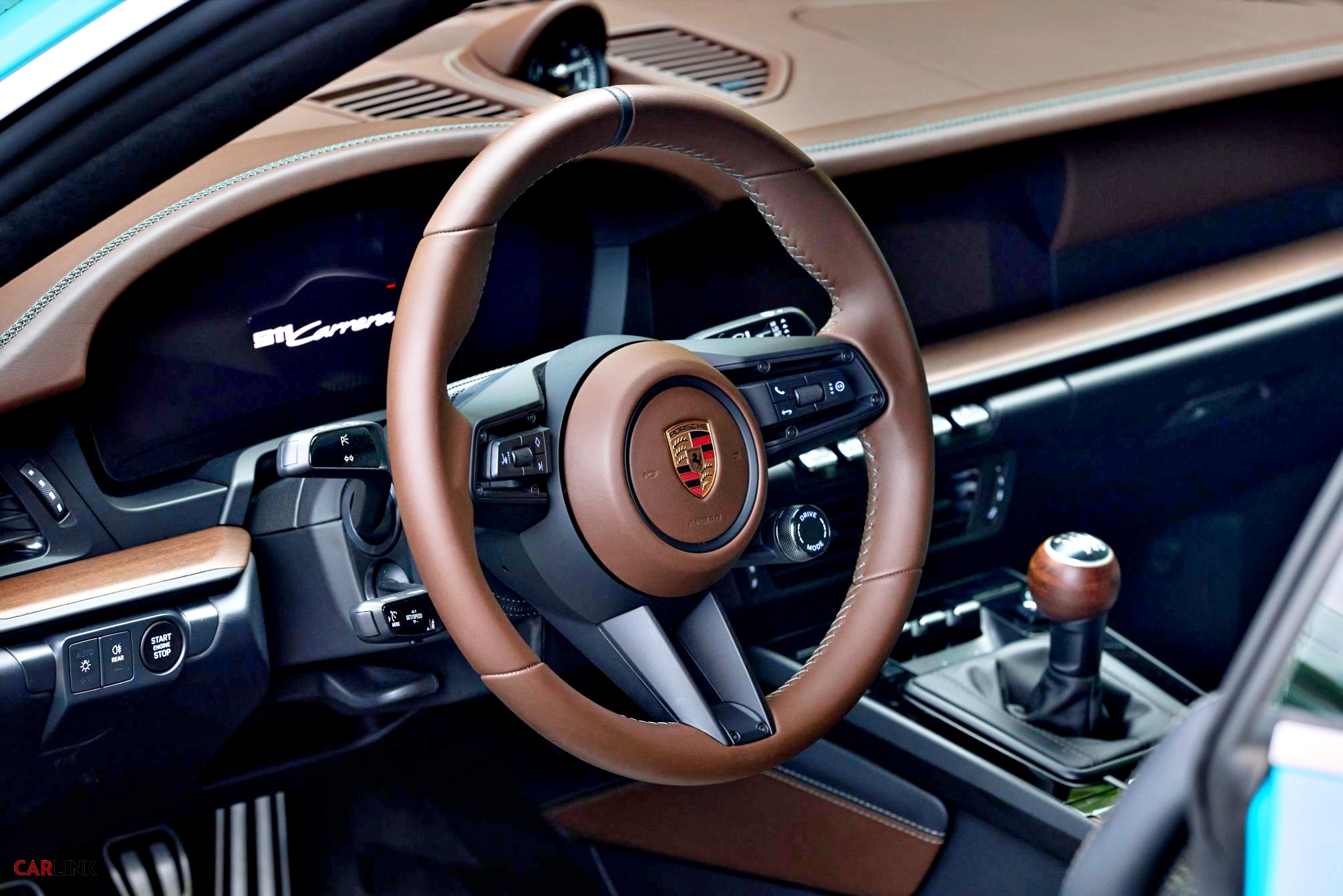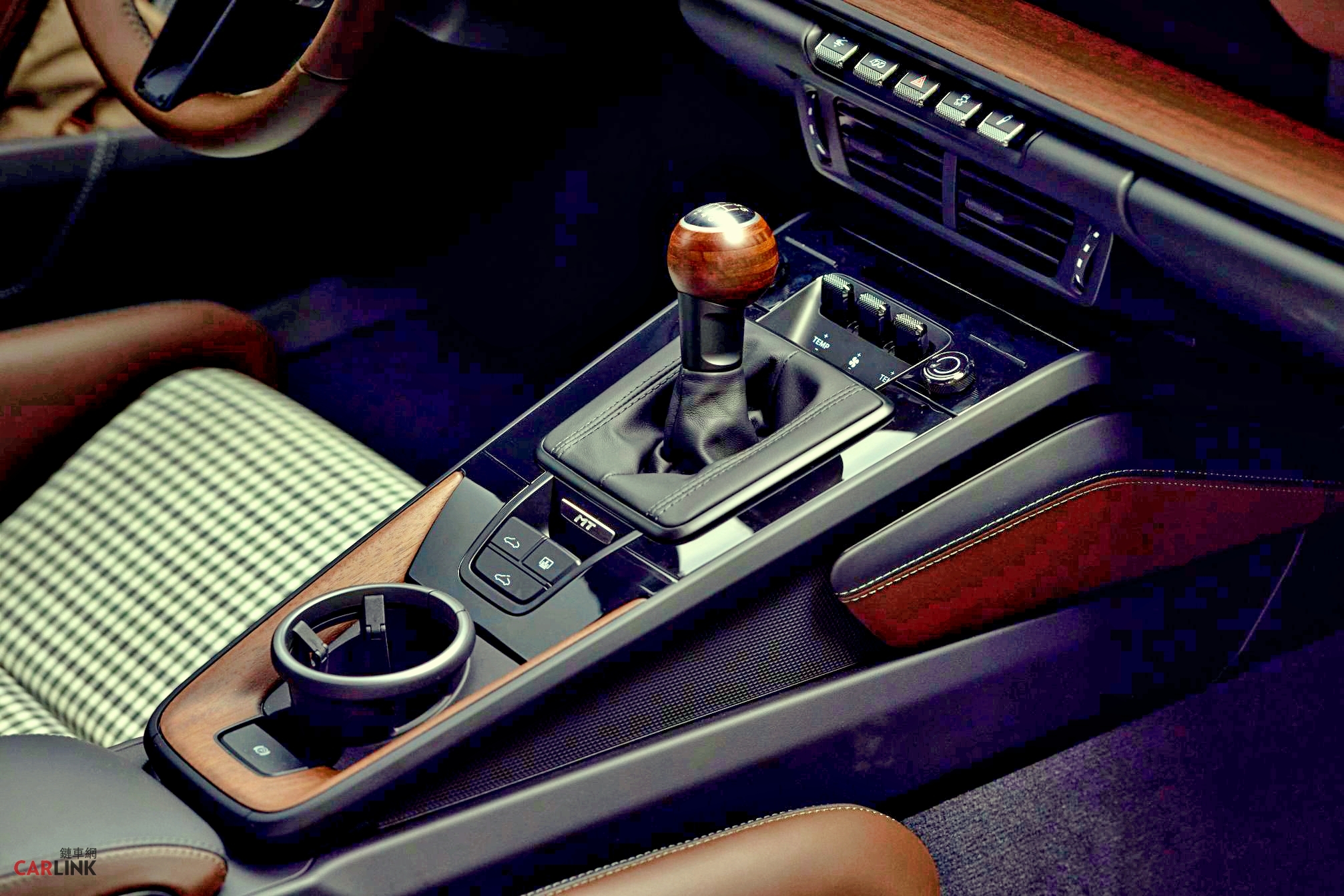 911 Carrera T「Formosa」車室設計延續台灣地景的敘事,以Paldao木紋飾板、松露棕(Truffle Brown)、黑色皮革、並以獨特的夜綠色(Night Green)縫線點綴,象徵山脈與綠意,盡顯奢華。