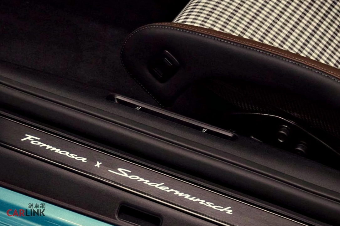 多項專屬訂製細節更進一步呈現這款跑車的獨特身份:發光式門檻飾板刻有「Formosa x Sonderwunsch」字樣,頭枕上的「Formosa」壓紋標誌則巧妙地將 911 Carrera T 的車身剪影與海浪、山脈的意象圖案融為一體,盡顯匠心。