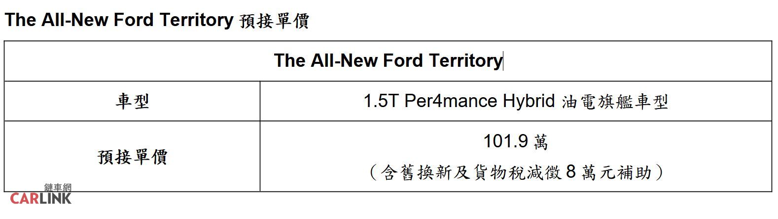 • 註二:本價格僅參考預售價,正式售價將於上市後公告,實際交易價格與條件由買方與Ford 授權經銷商依議定合約內容為準。預接單價以舊換新貨物稅減徵措施之新台幣8萬元計算,實際減徵金額依政府審核結果為準。