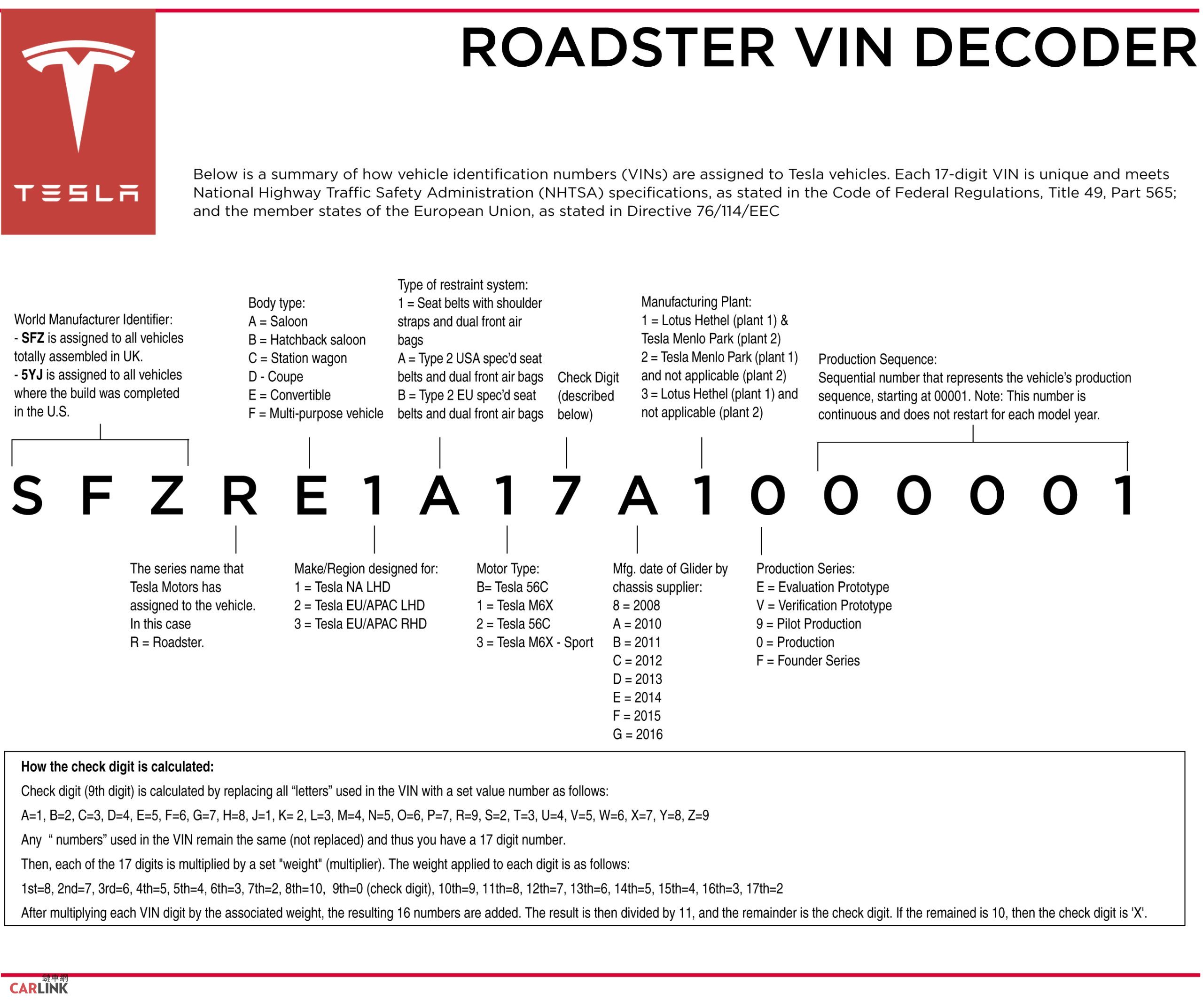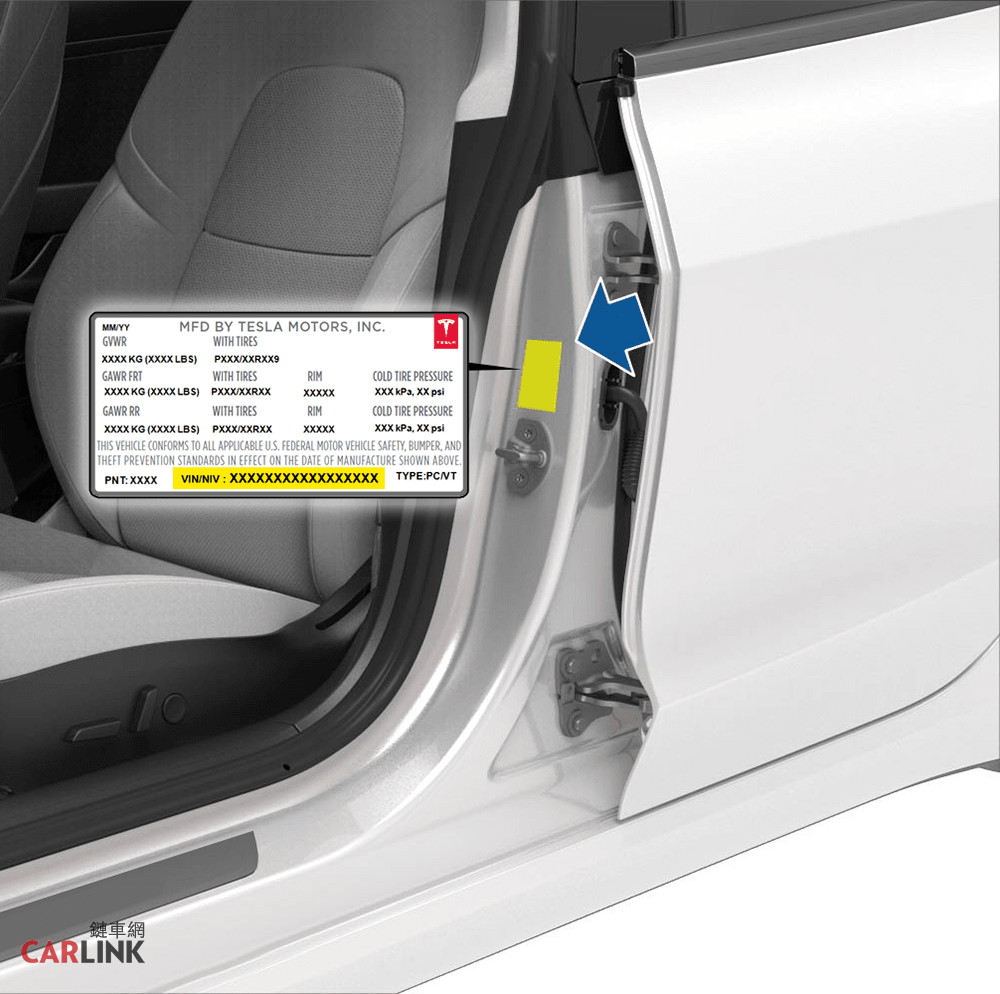 在解釋特斯拉VIN代碼之前,必須先找到這組17位的密碼才行。為了幫助辨識(如火燒車後還能清楚知道此車的基本資訊),所以Tesla通常會將VIN碼壓在前擋風玻璃下方、前門框、座椅下方、後門檻飾板下方等多個地方。當然也可以直接從車內的中央觸控螢幕操作,從Tesla APP頁面滑至底部,便可檢視軟體版本資訊以及車輛的VIN代碼。特斯拉的 17 位 VIN 識別碼可拆成多個部分,每段都代表不同的車輛資訊:第1-3位數:全球製造工廠識別碼(WMI)5YJ:特斯拉加州費利蒙工廠7SA:特斯拉奧斯汀工廠(或加州費利蒙工廠)LRW:特斯拉上海工廠XP7:特斯拉柏林工廠第4位數:車型Y:Model YS:Model S3:Model 3X:Model XC:CybertruckR:Roadster第5位數:車身類型A:五門掀背車左駕版B:五門掀背車右駕版C:MPV 5 門左駕版D:MPV 5 門右駕版E:四門轎車左駕版F:四門轎車右駕版G:MPV 5 門左駕版H:MPV 5 門右駕版第6位數:安全帶系統1:手動安全帶 (前排、後排x3) + 前氣囊、PODS、側面充氣保護、膝部氣囊 (前排)7:手動安全帶 (前排、後排x3) + 前氣囊、側面充氣保護A:手動安全帶 (前排、後排3、第三排2) + 前氣囊、PODS、側面充氣保護、膝部氣囊B:手動安全帶 (前排、後排2、第三排2) + 前氣囊、PODS、側面充氣保護、膝部氣囊C:手動安全帶 + 前氣囊、PODS、側面充氣保護D:手動安全帶 (前排、後排x3) + 前氣囊、PODS、側面充氣保護、膝部氣囊第7位數:電池類型E:三元鋰離子電池F:磷酸鐵鋰電池(僅限上海工廠製造的車輛)第8位:馬達 / 特性5:雙馬達6:三馬達A:單馬達標準(3DU 800A)B:雙馬達標準C:雙馬達性能D:單馬達標準E:雙馬達標準F:雙馬達性能(3DU 800A)J:單馬達標準K:雙馬達標準L:雙馬達性能R:單馬達標準(3DU 600A)S:單馬達標準(DUB 600A)第9位:校驗字符校驗碼是根據 VIN 所有數字進行數學計算的結果,設計目用於驗證 VIN 碼的可靠性,降低錯誤和欺詐的疑慮,其數值為 1 ~ 9 或是 X。第10位數:車輛年份H:2017年J:2018年K:2019年L:2020年M:2021年N:2022年P:2023年R:2024年此定義乃是根據更早期的 VIN 碼國際標準,第 10 位字符都是用來標示車輛的製造年份,每個字母或數字代表一個特定的年份,並按照一定的規則順序循環使用。第11位數:製造地點F:美國加州費利蒙(Model S、Model 3、Model X、Model Y)C:中國上海(Model 3、Model Y)A:美國德州奧斯汀(Model Y、Cybertruck)B:德國柏林(Model Y)第12~17位數:序列碼「000001 ~ 999999」特斯拉使用第 12至17 位數直接表示車輛的生產序號,從 000001 開始,因此每一輛車都有其專屬編號,不會重複,否則就是仿冒、AB車、複刻...。然而VIN碼的定義與規則並非永遠不會改變,因此最新資訊仍須參考特斯拉官方網站與服務手冊,方能隨時瞭解最準確的 VIN 代碼定義。