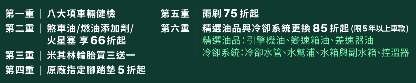 - 專屬升級方案:米其林輪胎買三送一、精選油品與冷卻系統更換85折起(限5年以上車款)