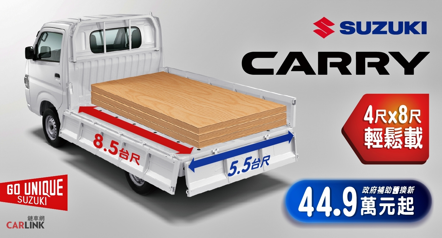 專為職人打造、在地頭家首選的 SUZUKI CARRY,以超實用的 8.5 x 5.5 尺大貨台設計,讓業界常見的 4x8 尺板材能「剛剛好」平整上車、不必傾斜、不怕損傷,成為木工師傅與行動商家的運輸首選。CARRY 長年在台灣市場受到職人肯定,不僅擁有強勁耐用的底盤設計,搭配高實用性的貨台與 SUZUKI 一貫的品質保證,是您事業上的得力夥伴。限時優惠、錯過可惜!歡迎洽全台 SUZUKI 商用車經銷據點了解詳情!
