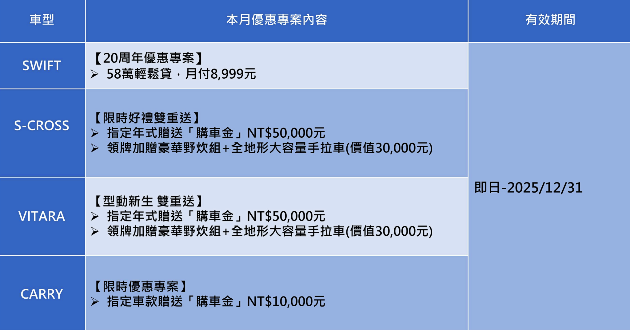 Suzuki車迷注意啦!年底衝刺購車旺季來了,TAIWAN SUZUKI祭出超狂12月優惠,Swift慶祝20週年輕鬆月付8,999元、S-CROSS與Vitara各送5萬購車金、Carry職人專屬1萬優惠,還有Jimny硬派越野王等你挑戰極限!這些暢銷神車不只安全升級滿點(DSBS II、LKA、ALLGRIP四驅超穩),輕油電科技省油又好開,無論城市通勤還是戶外探險,都能滿足你的駕馭癮頭——趕緊衝經銷商試駕,錯過再等一年!
