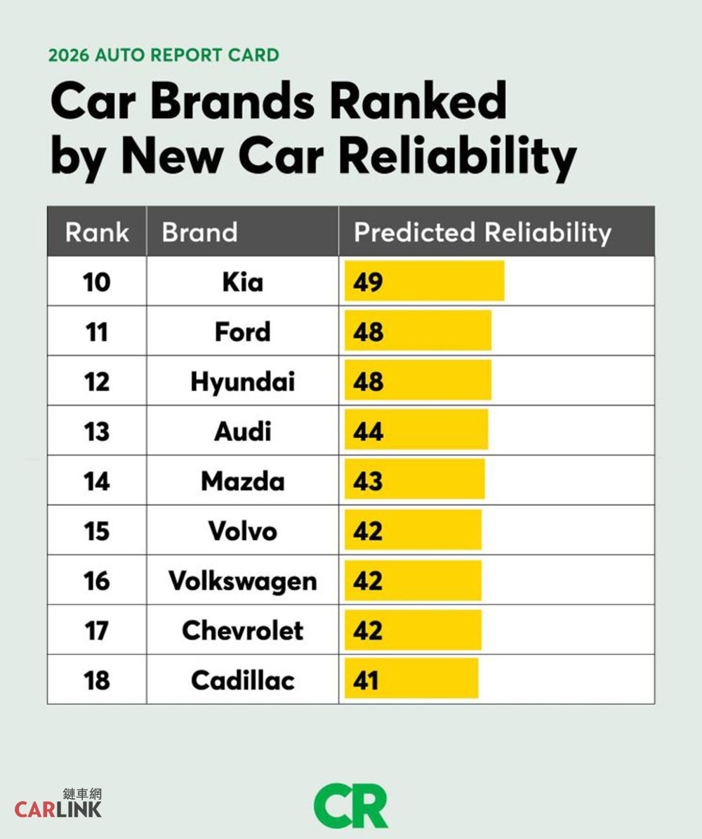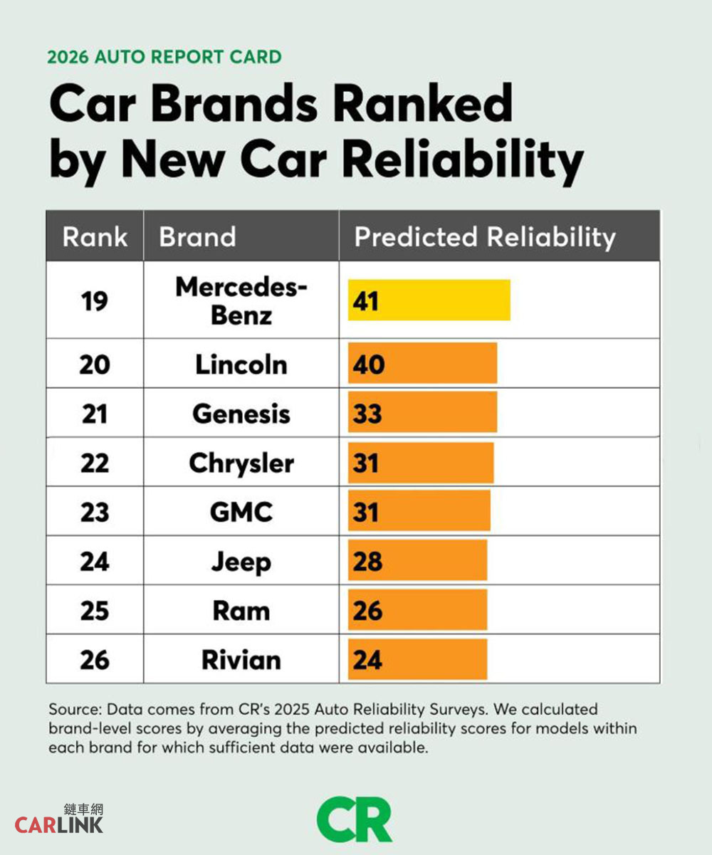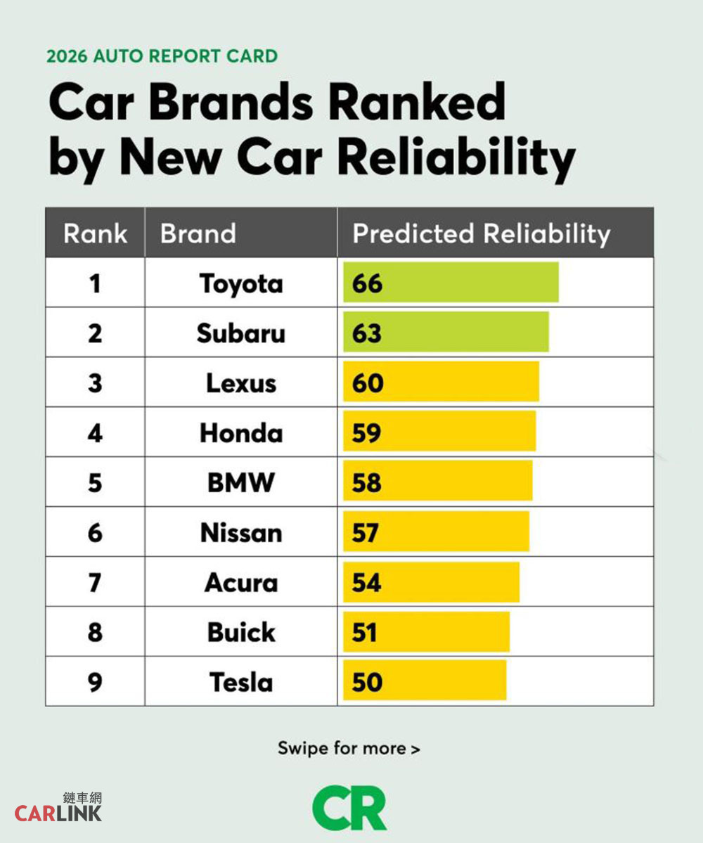 在最新一期的《消費者報告》二手車可靠度調查中,Tesla品質墊底,排名第26位,可靠度評分僅31分,低於Jeep和、Ram、Chrysler,看樣子美國汽車品牌可靠度普遍不彰。當然這也是美國自家人做的可靠度調查,完全不遮掩北美品牌中古車就是不太可靠,顯見其可靠度真的很可靠!該調查涵蓋美國地區26個品牌、車齡在5至10年之間的車型,相關調查堪稱全面,因此可信度極高。《消費者報告》中古車長期可靠性調查:1. Lexus — 77 2. Toyota — 733. Mazda — 584. Honda — 575. Acura — 536. BMW — 537. Buick — 518. Nissan — 519. Audi — 4910. Volvo — 4811. Mercedes-Benz — 4712. Subaru — 4713. Volkswagen — 4614. Lincoln — 4615. Mini — 4616. Cadillac — 4517. Hyundai — 4318. Chevrolet — 4019. Ford — 3920. Dodge — 3921. Kia — 3922. GMC — 3723. Chrysler — 3624. Ram — 3525. Jeep — 3226. Tesla — 31《消費者報告》汽車數據分析項目負責人史蒂文·埃萊克表示:Lewxus和Toyota等品牌之所以名列前茅,乃是因為它們採取了“保守的更新設計”並“逐步改進全車品質”,而不是採用尖端技術進行大規模更新,因此隨著車齡的增長,依然保持可靠。