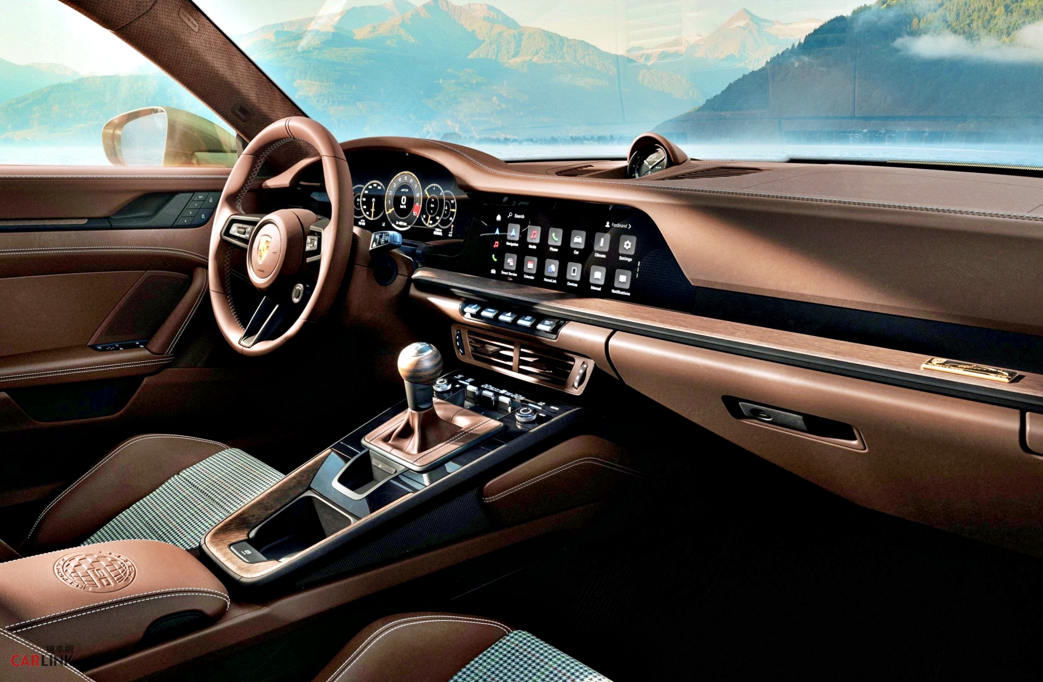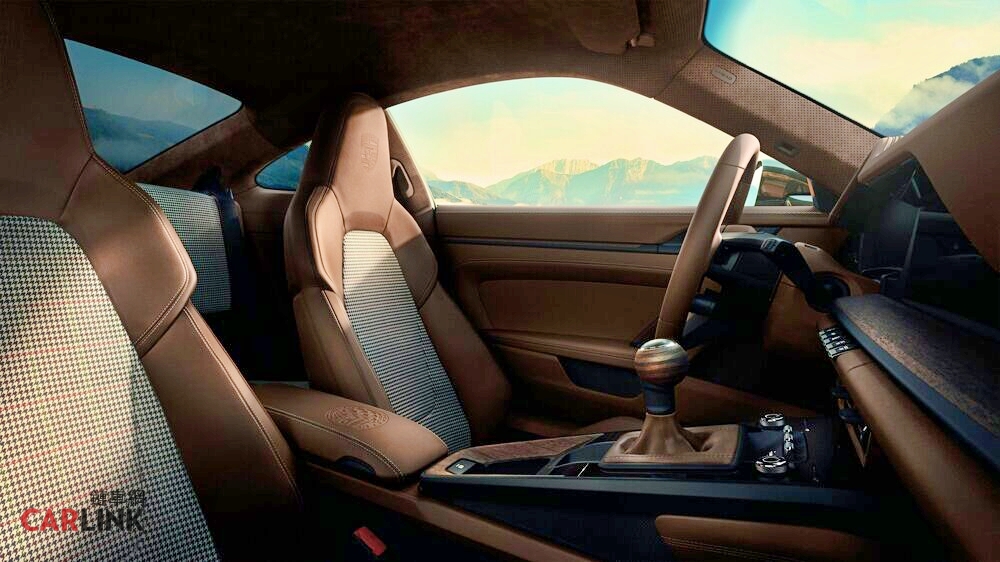 石灰黃(Chalk Beige)縫線、以及採用F.A. 格紋織布材質的中央椅面,與松露棕色 Club 真皮內裝(Truffle Brown)搭配,營造專為紀念 F. A. Porsche 的獨特色調。F.A. 格紋織布材質也被運用在手套箱、公事夾以及前行李廂的雙面地墊上。