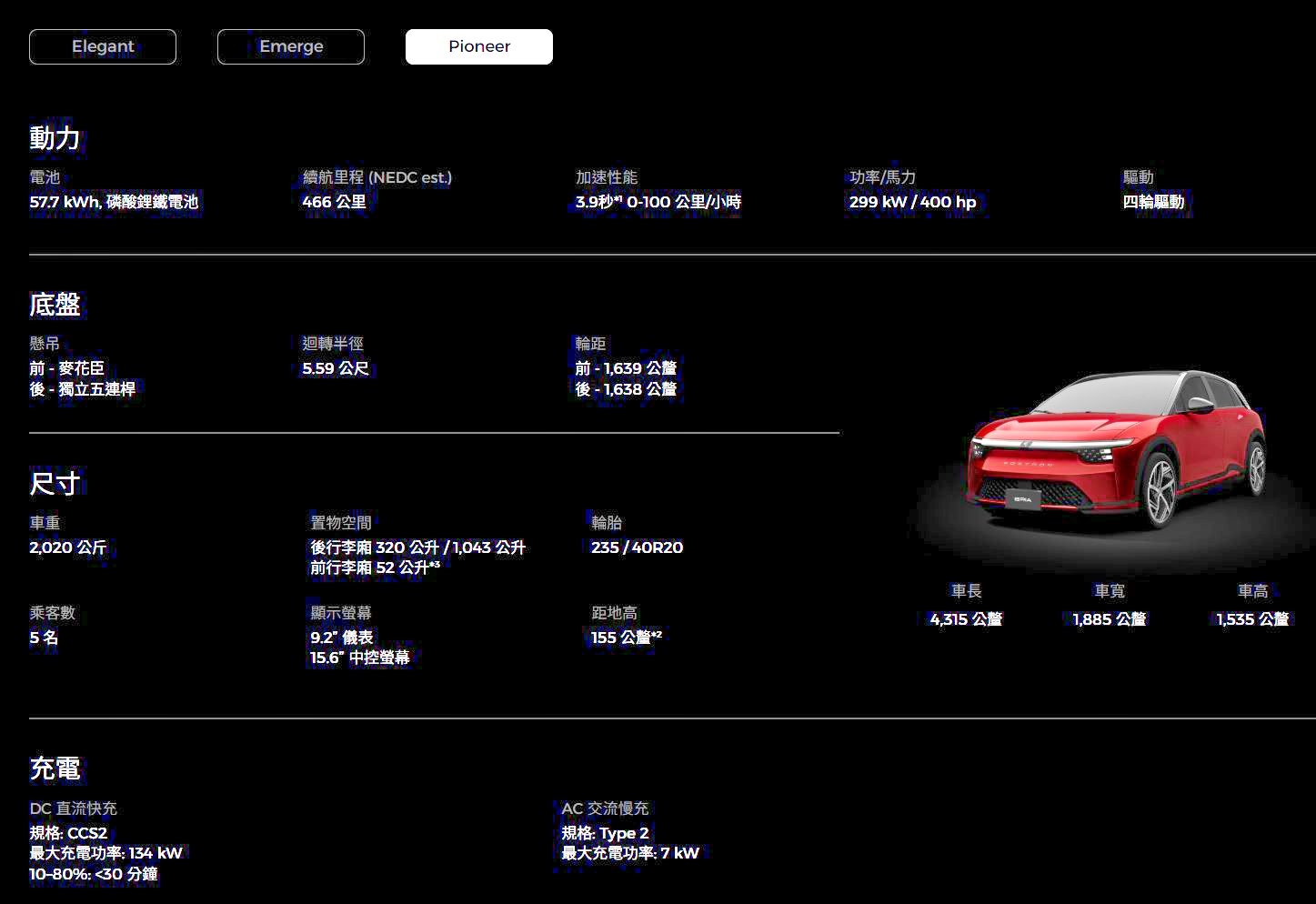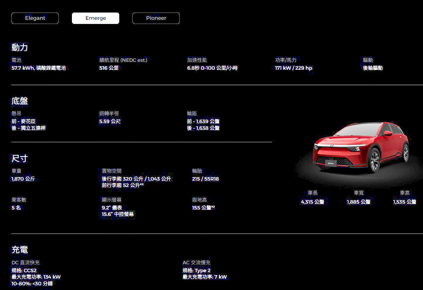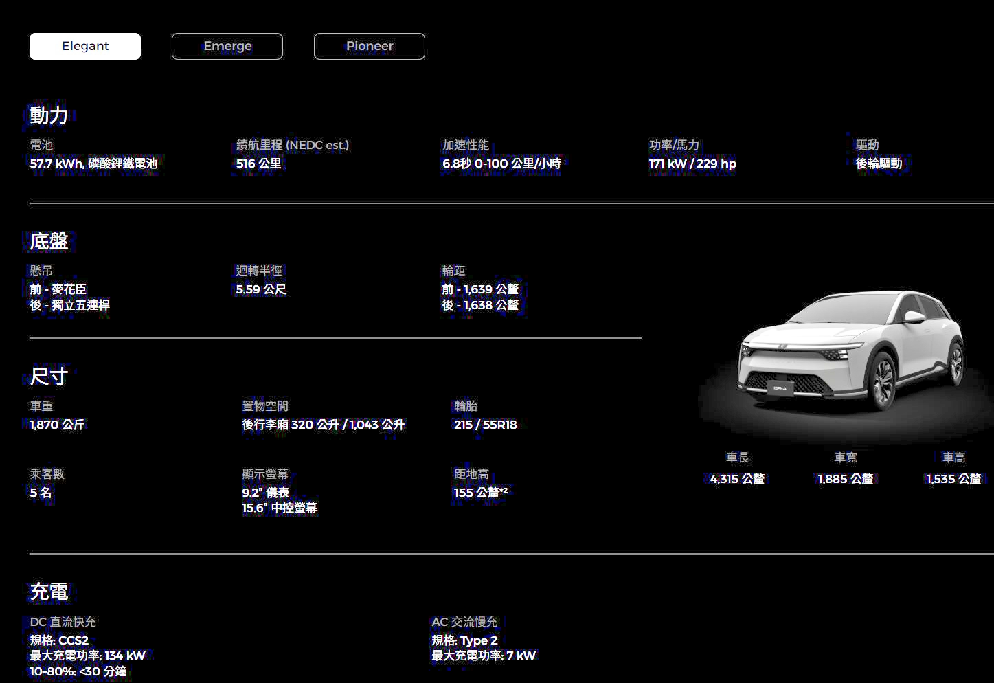 在動力與續航表現(NEDC標準)上:Elegant / Emerge:229匹馬力後驅配置,續航最高516公里,Pioneer:400匹馬力四驅配置,續航466公里,加速0–100約3.9 秒。這樣的三段式配置策略,不只是堆疊規格,而是為不同車主圈層提供清楚明確的選擇:從追求效率、日常通勤到想要動力表現的族群,都能找到對應版本。