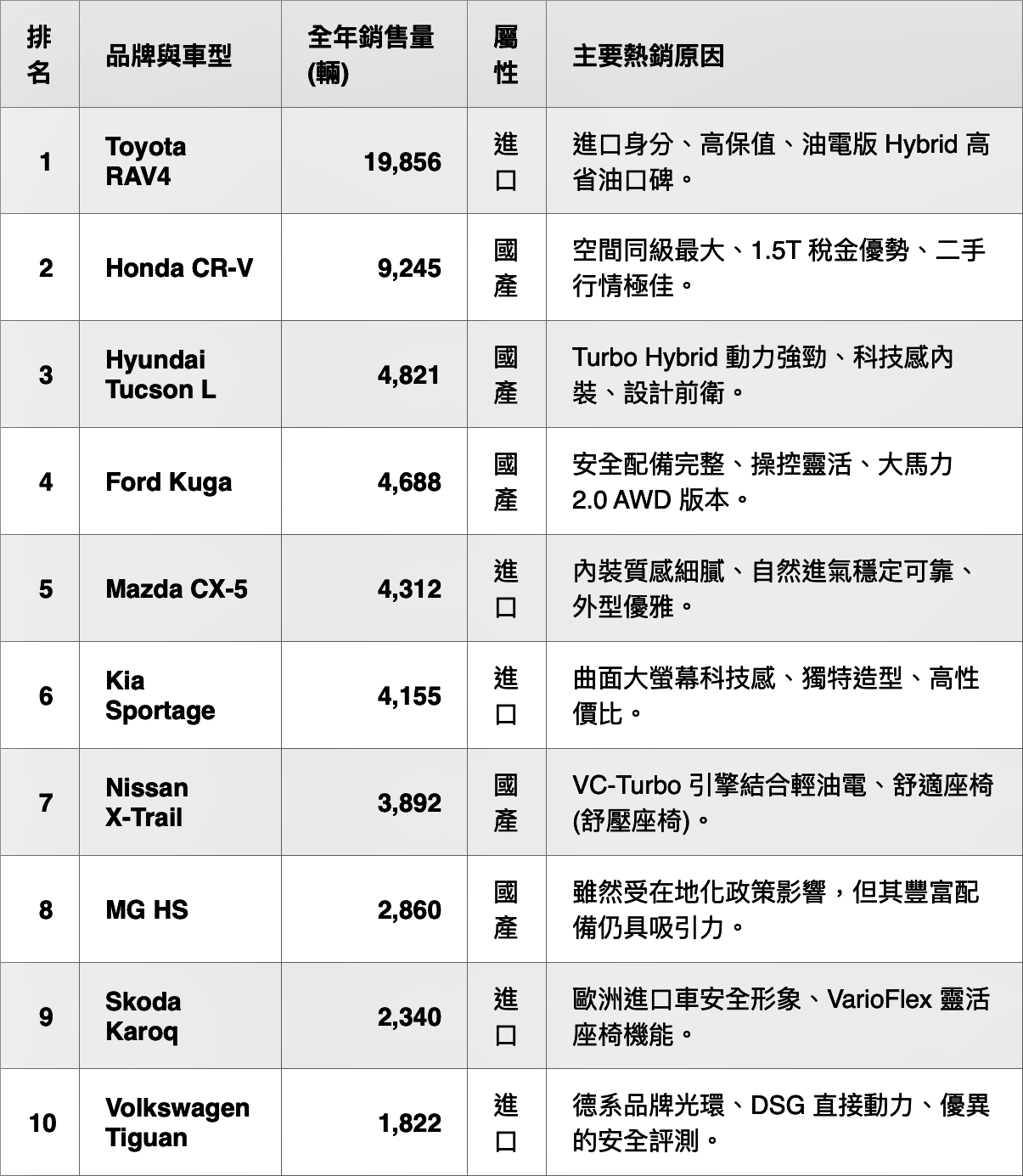 - Toyota RAV4獨走局面:儘管國產品牌推陳出新,RAV4依然靠著強大的品牌忠誠度與油電系統的穩定性,以近兩萬輛的成績蟬聯中型休旅冠軍。