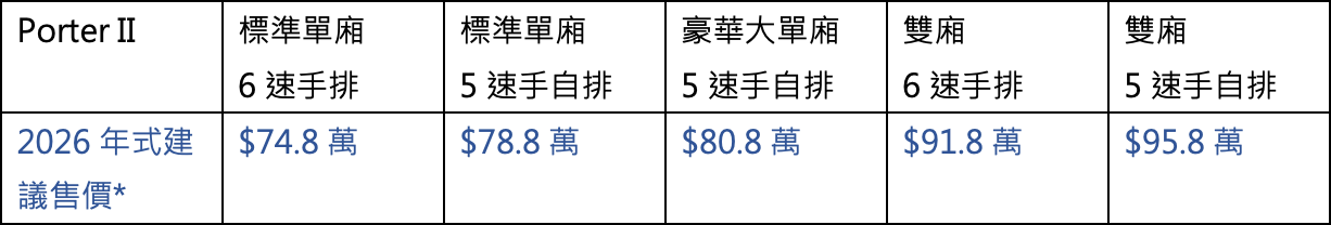隨著 2026 年式 PORTER II 全車系正式導入,HYUNDAI 汽車公布最新建議售價如下。HYUNDAI汽車將持續強化商用產品陣容與售後支援,讓 PORTER II 柴油小霸王不僅是台灣貨運與工務市場的銷售冠軍,更是每位頭家事業成長路上的最佳夥伴。
