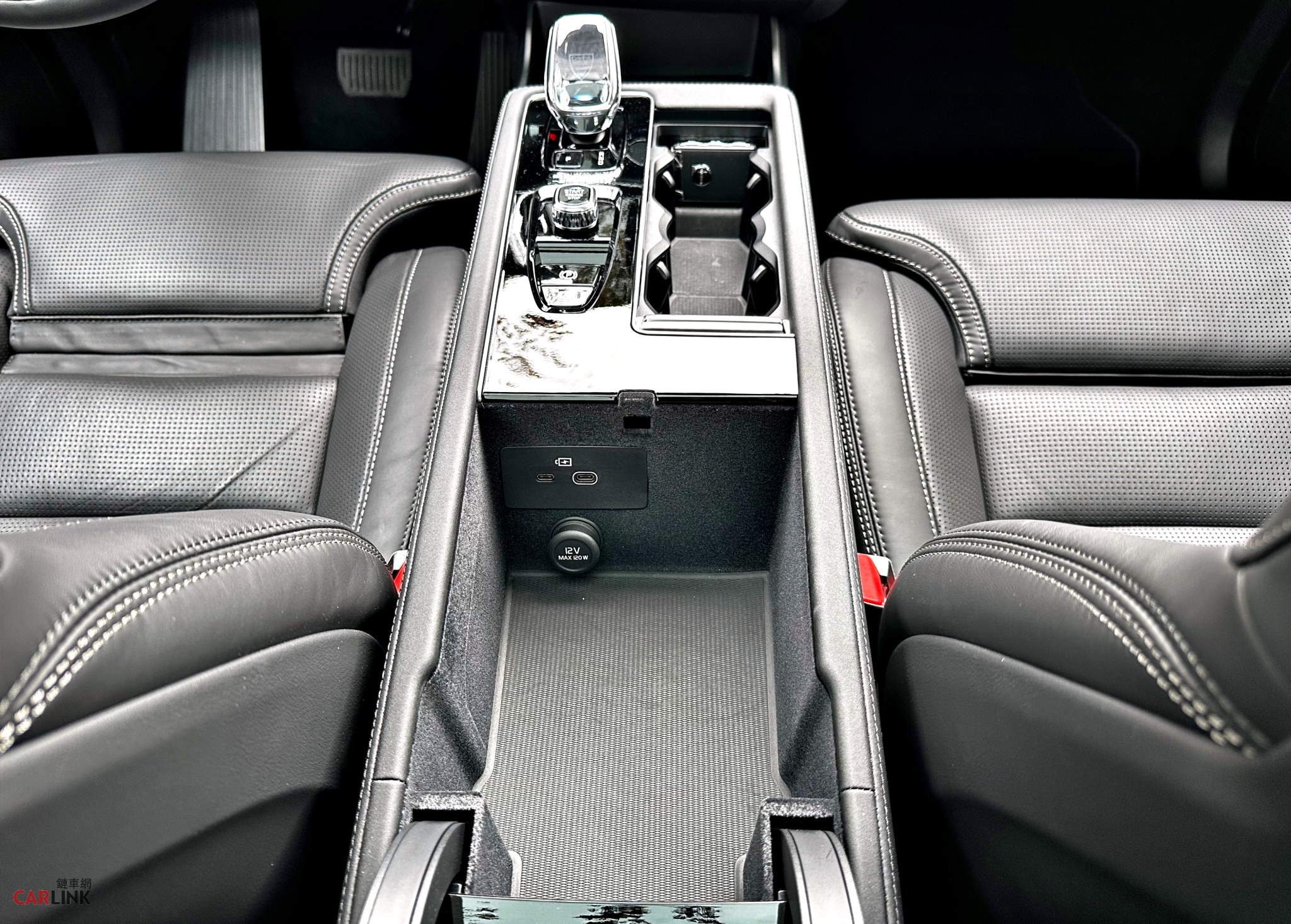 ▲整合觸控螢幕中控台的軟墊扶手下方提供收納空間,滾蓋下方還有一個小儲物空間,並設有可容納兩杯飲料與一罐細長飲料罐的杯架。