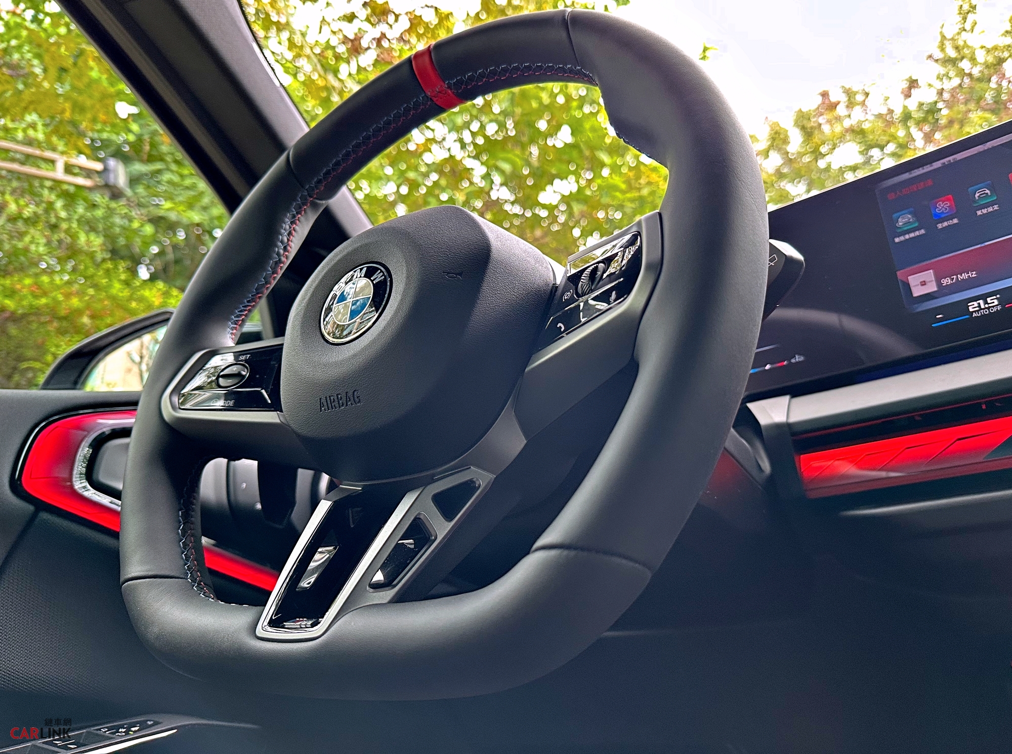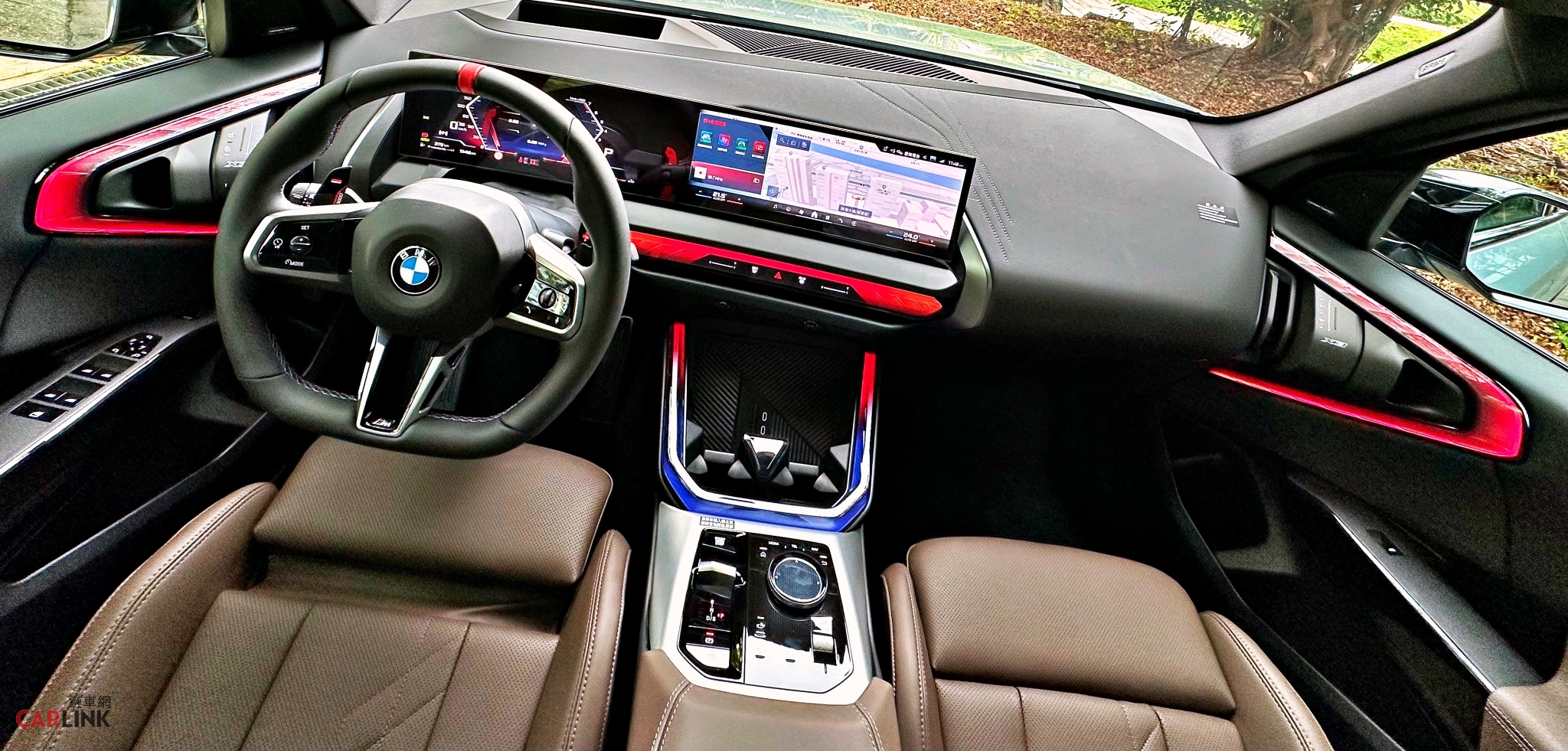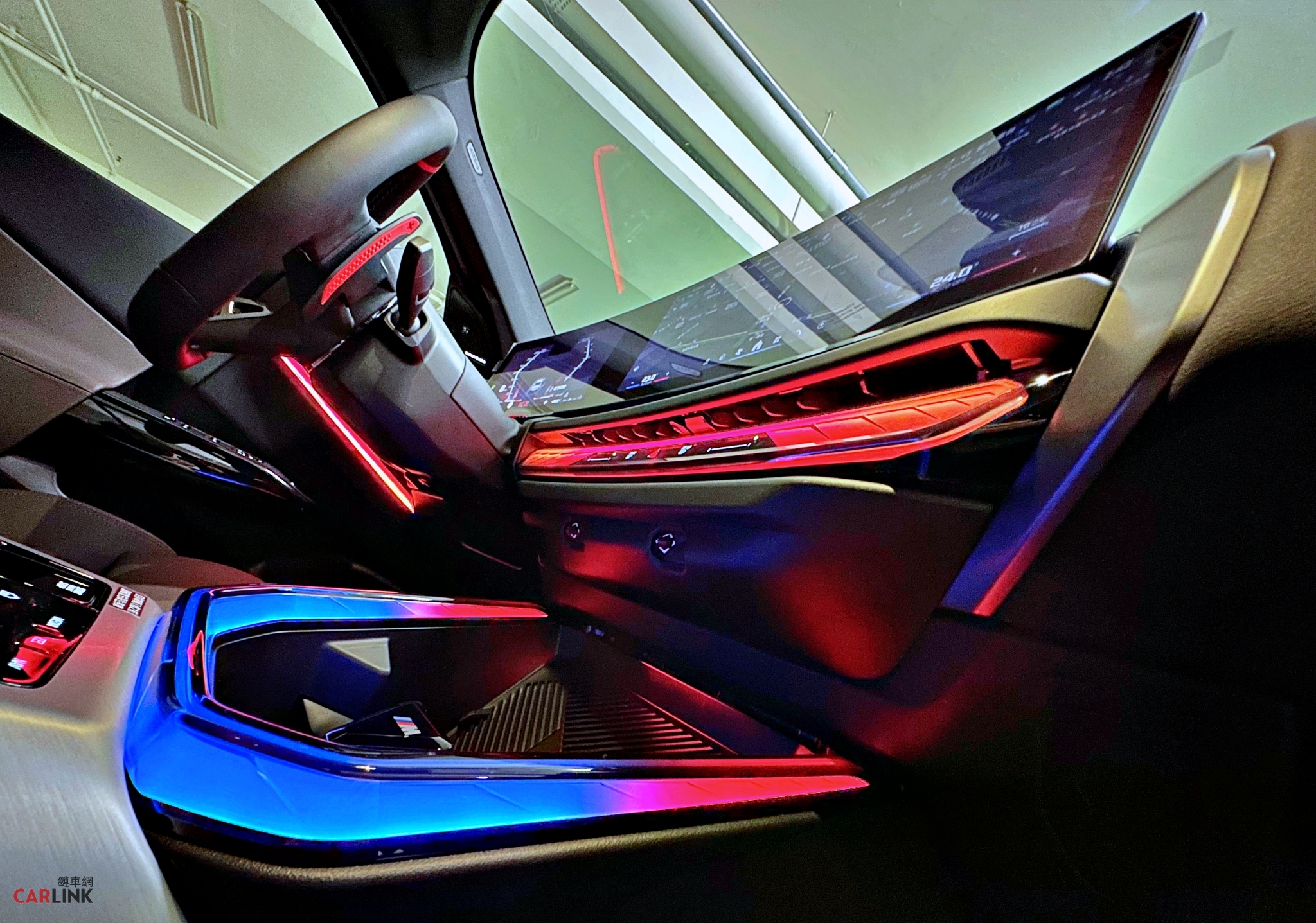 打開車門,氣氛立刻轉換。BMW專屬的環繞光幕從車門延伸至中控鞍部,與懸浮式曲面螢幕(12.3吋儀錶+14.9吋中控觸控螢幕)交織出未來感十足的科技劇場。光影流動間,仿佛進入駕駛者的專屬座艙舞台。