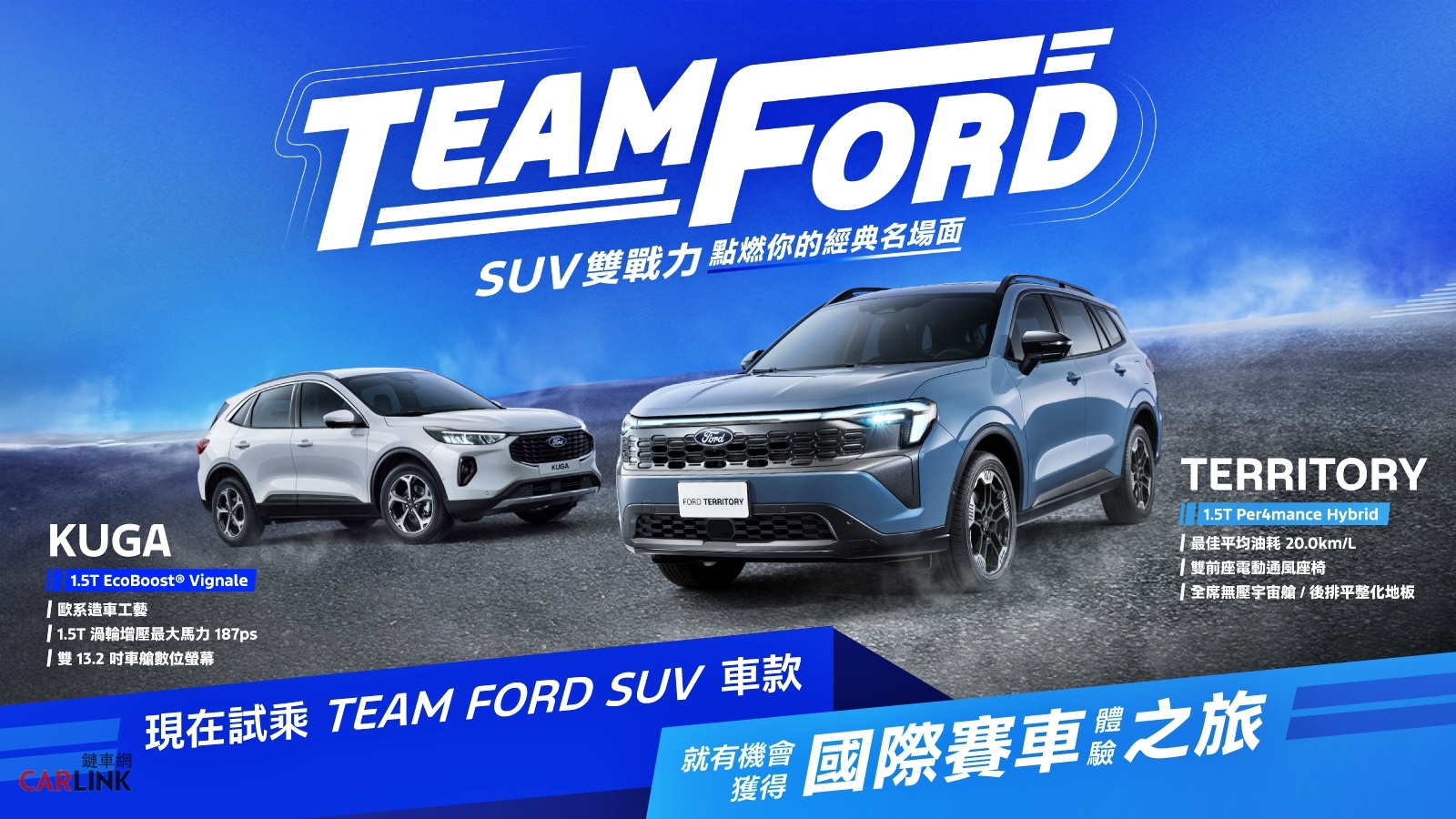 自2026年2月1日起至2月28日止,至全台Ford展示中心試駕任一車款,即可獲得限量烘爐地開運錢母,入主週週抽黃金墜飾;此外,「TEAM FORD SUV 雙戰力 #點燃你的經典名場面」活動同步展開,活動期間試駕The All-New Ford Territory或The All-New Ford Kuga雙車系,即可獲得「國際賽車體驗之旅」抽獎資格乙次。在空間與安全方面,The All-New Ford Territory擁有2,726mm軸距與同級唯一後座平整地板設計,提供充裕頭部與膝部空間,多達22處置物空間與1,150mm後行李廂開口,搭配6/4分離椅背及足踢感應電動尾門,滿足家庭日常與出遊需求。安全科技上,配備Ford Co-Pilot360™ Drive+全方位智駕科技輔助系統,包括360⁰環景影像行車輔助系統、FAPA主動式停車輔助系統5.0與LRAS循跡倒車輔助功能,結合超過65%超高強度鋼材車體、熱成型高強度一體式門框及A至B柱硼鋼強化,守護全家每一次出行。