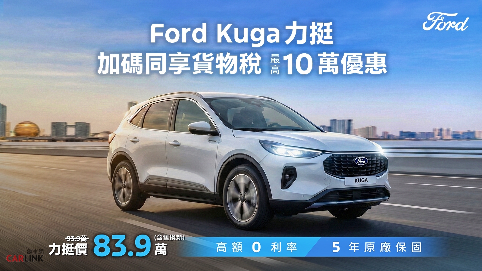 活動期間入主The All-New Ford Kuga 1.5T享力挺價83.9萬(含舊換新),內含5萬元力挺購車金、高額0利率及5年原廠保固。