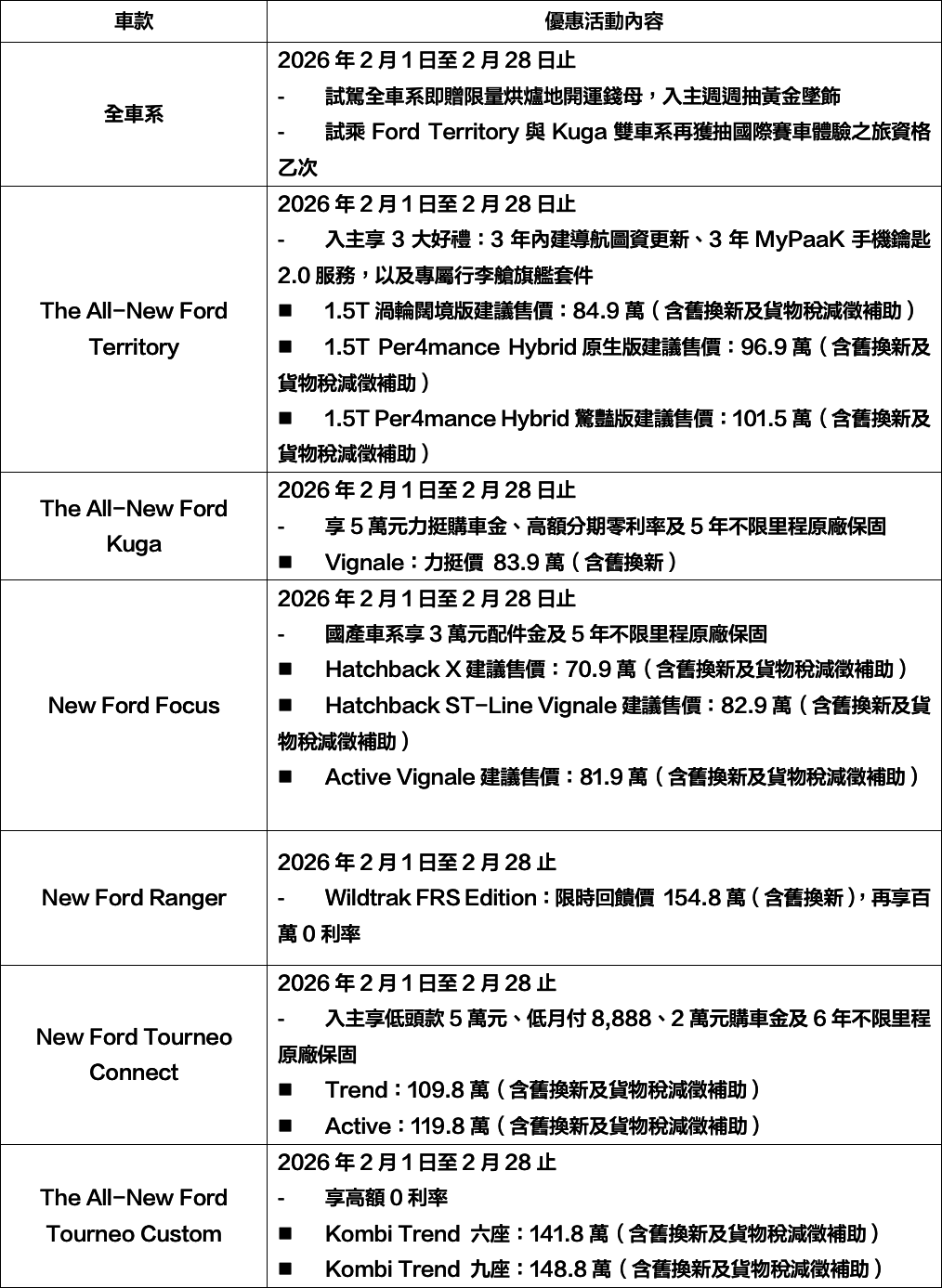 歐洲超能智駕跑旅The All-New Ford Kuga採用1.5T EcoBoost®渦輪增壓汽油引擎,經專屬調校可輸出187ps的強勁動力,帶來隨心暢快的駕馭體驗,入主享力挺價83.9萬起(含舊換新),加碼高額分期0利率及5年原廠保固;New Ford Ranger Wildtrak FRS Edition搭配全新FRS可調式裝載系統,提供靈活裝載空間,無論工作還是休閒,都能從容應對各種情境,入主即享限時回饋價154.8萬(含舊換新),及百萬0利率;New Ford Focus擁有動感外型與德規底盤調校,入主享貨物稅優惠價70.9萬起,再加碼3萬元配件金及5年原廠保固;歐洲進口正七人座New Ford Tourneo Connect福特旅玩家,享貨物稅優惠價109.8萬起,再加碼2萬元購車金、低頭款5萬、低月付8,888及6年不限里程原廠保固〔註四〕;歐洲首選國際商旅The All-New Ford Tourneo Custom福特旅行家,享貨物稅優惠價141.8萬元起,入主再享高額0利率。