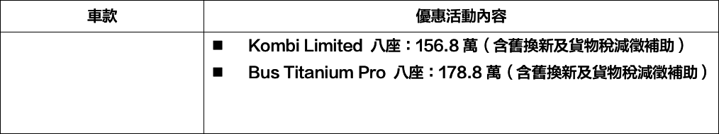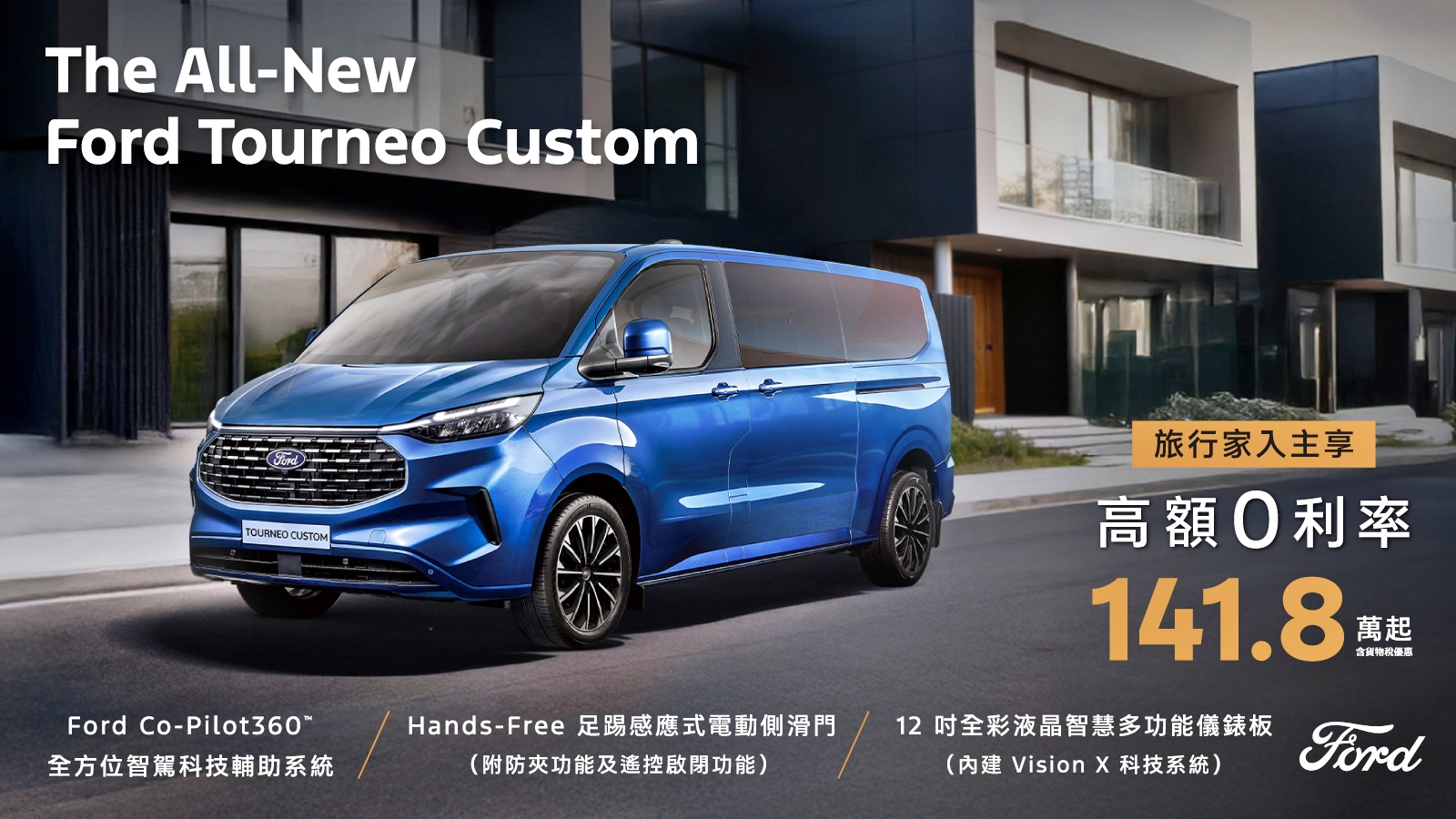 入主The All-New Ford Tourneo Custom福特旅行家,享貨物稅優惠價141.8萬元起,入主再享高額0利率。+Ford二月份車款優惠方案