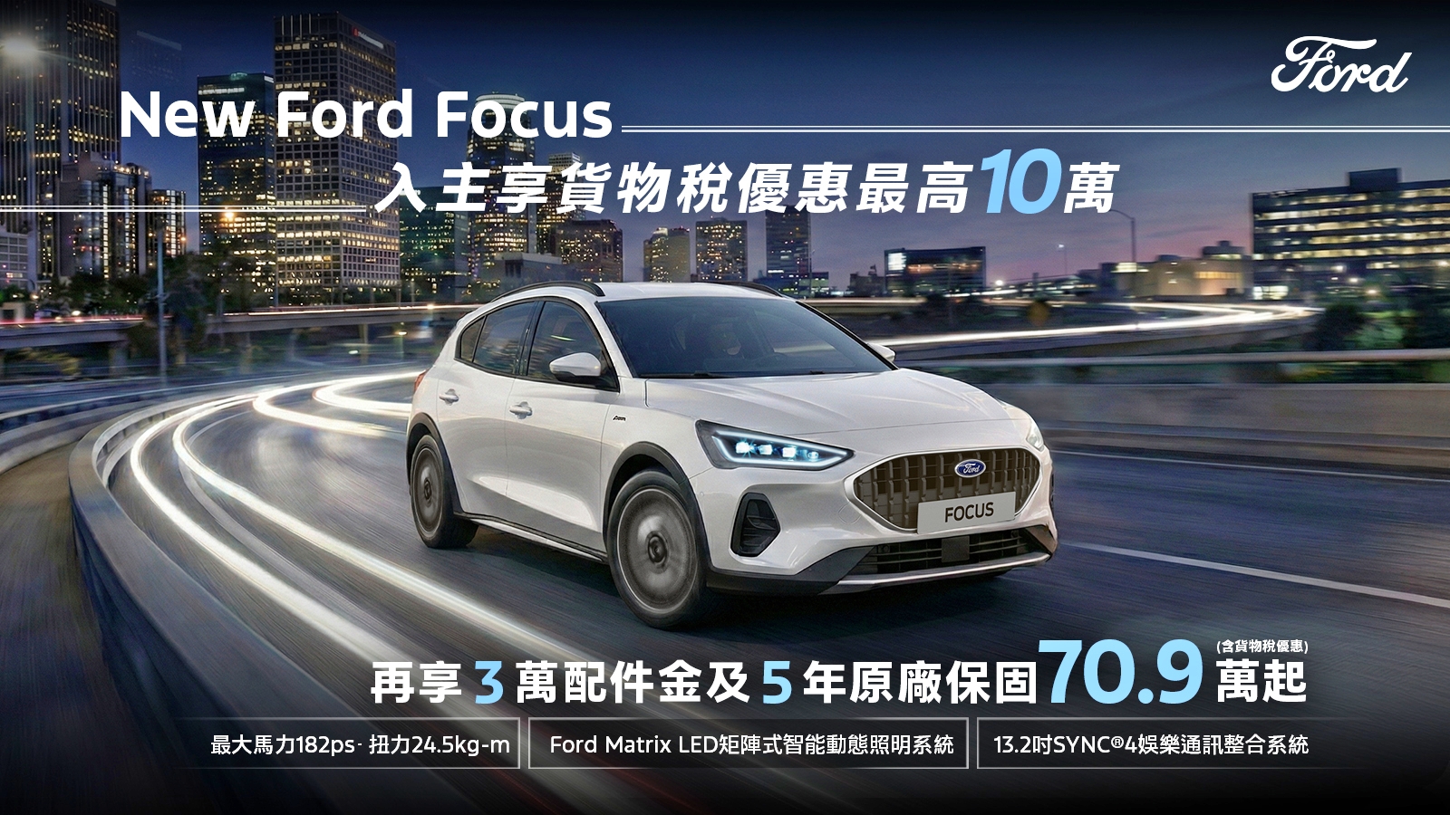 入主New Ford Focus享貨物稅優惠價70.9萬起,再加碼3萬元配件金及5年原廠保固。