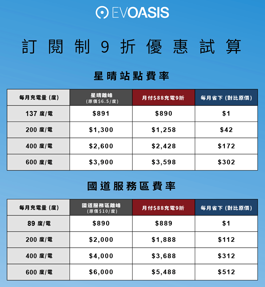 月付88元訂閱制適用一般電車車主,日常通勤、國道出行都能省。「月付 88 元」訂閱方案適用範圍涵蓋星晴費率站點與國道服務區站點,合計全台已超過 91 站,並將持續增加。優惠時段為平日離峰與假日全時段。以星晴平日離峰為例,原每度 6.5 元,訂閱後享 9 折,搭配 EVOASIS 儲值金 5% 回饋,以及指定信用卡最高 5% 回饋(以永豐銀行方案為例),回饋疊加換算後,每度電最低5.27 元。星晴假日原每度 8.4 元,訂閱後約每度 7.56 元;國道服務區離峰原每度 10 元,訂閱後為每度 9 元,讓平常通勤補電或長途行程在服務區補電,省錢更有感。車主可直接在 EVOASIS App 的訂閱方案頁面選擇「月付 88 元」,完成付款即可開通。開通後不需要輸入車號,系統會在下一次 DC 充電時自動完成車輛綁定,並透過 App 推播及 E-mail 通知回報。方案以月為一期,期滿將自動續訂;如不續訂,可於方案頁面取消,流程清楚好操作。