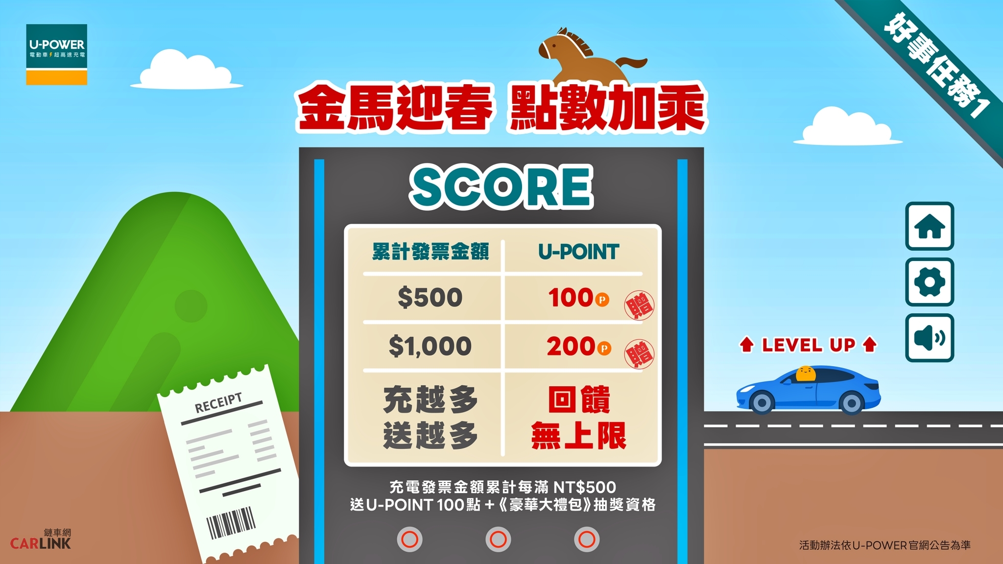 1. 好事任務一|金馬迎春,點數加乘:活動期間內,充電消費發票金額累計每滿 NT$500,即可獲得U-POINT 100 點,累計回饋無上限。讓春節期間的每一趟行程都能轉化為實質回饋。