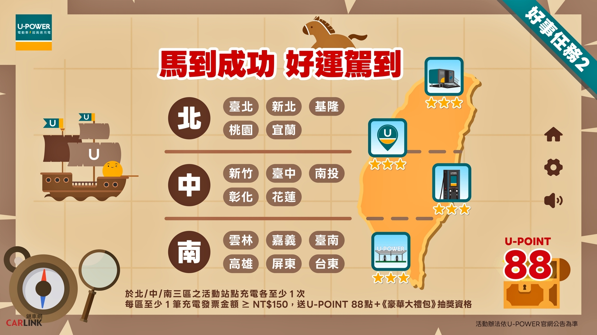 2. 好事任務二|馬到成功,好運駕到:活動期間內,會員於北、中、南三個區域之活動站點註2各完成至少 1 次充電;且每區皆有 1 筆發票金額達 NT$150(含) 以上,即可獲得 U-POINT 88 點。走春跨區充電,輕鬆解鎖好禮。