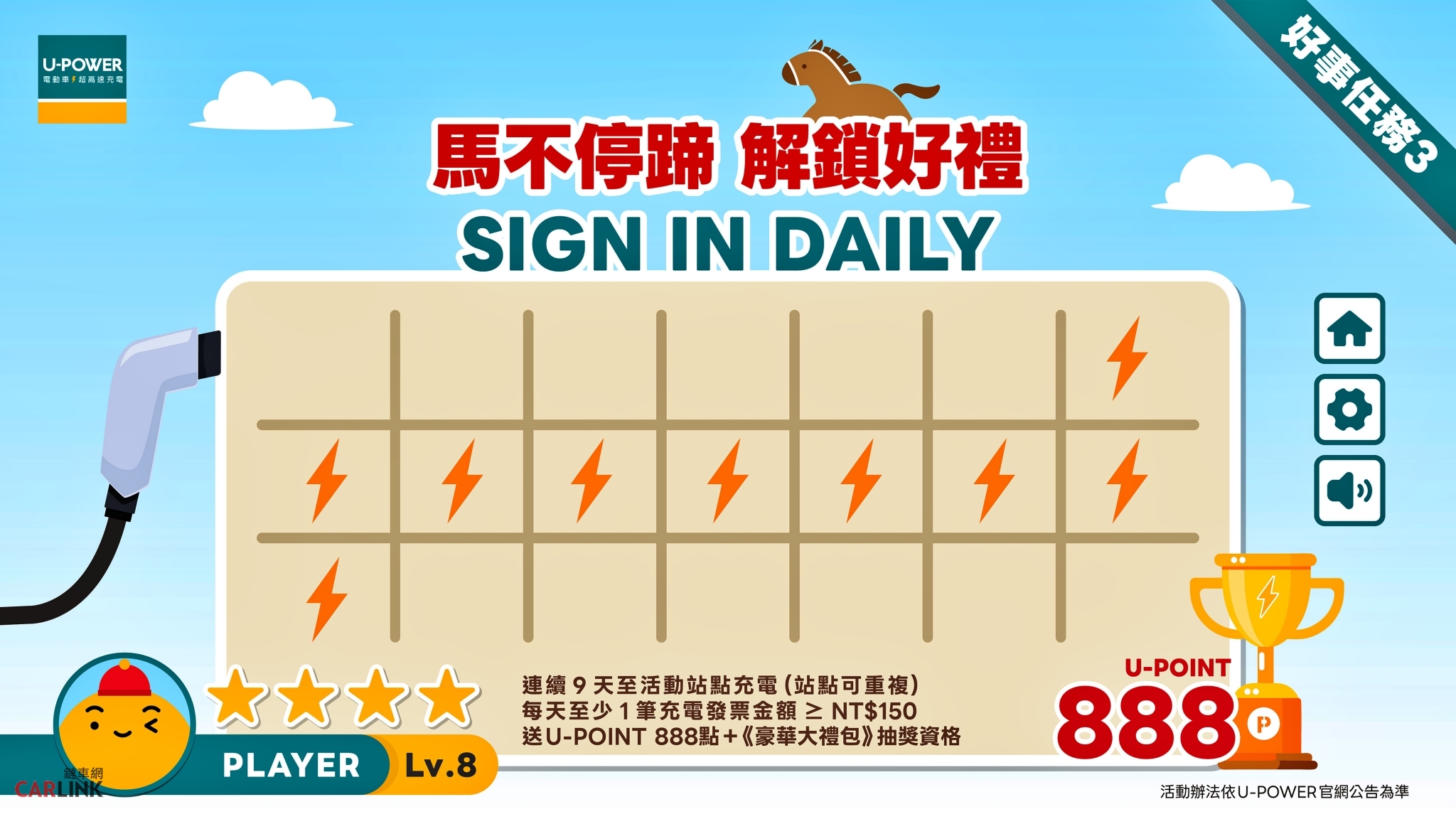 3. 好事任務三|馬不停蹄,解鎖好禮:活動期間連續 9 天完成充電(站點可重複),且每日皆有1筆發票金額達 NT$150(含)以上,即可獲得 U-POINT 888 點。完成任一任務,除了可獲得對應點數回饋外,還可參加《豪華大禮包》抽獎,並有機會抽中 「U-POINT 20,000點 」(5名) 或 「2026 年U-POWER 站點離峰與假日充電 8 折優惠」(20名)。年度充電活動再登場,新春出行好康滿載