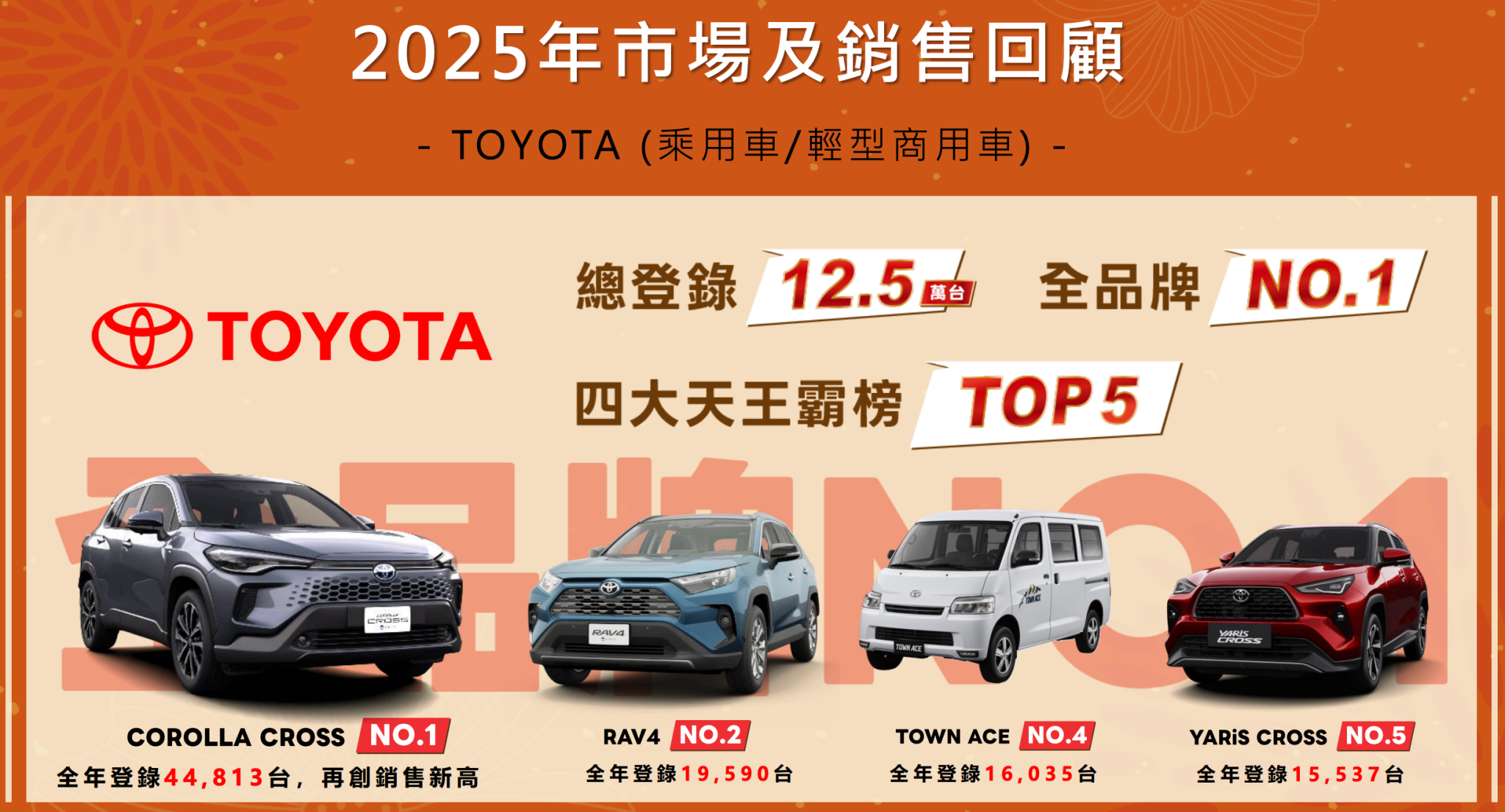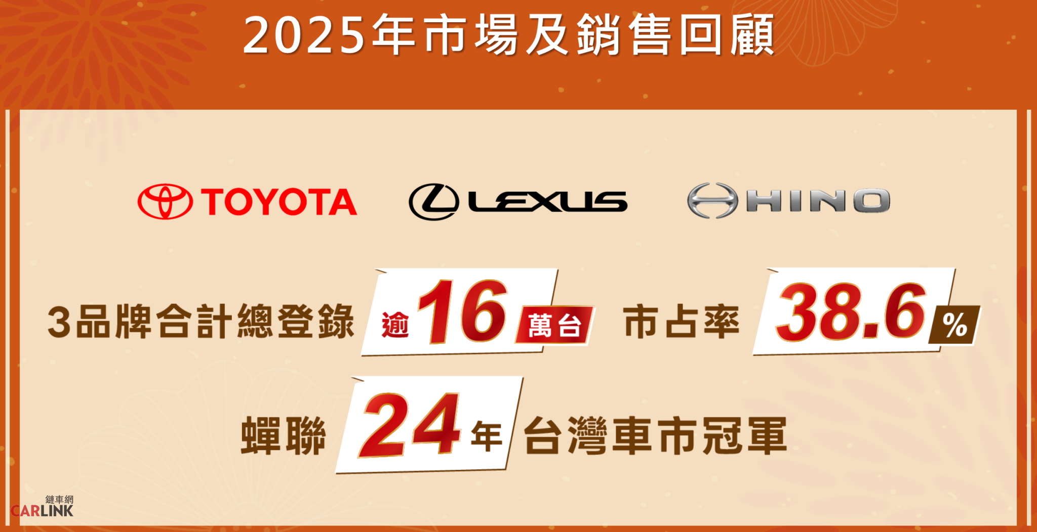 2025年雖受關稅影響整體車市需求,全年總市場仍達414,436台。和泰汽車三品牌在2025年合計登錄台數逾16萬台,市佔率躍升至38.6%,創下近16年來最佳表現,同時也穩坐24年台灣車市冠軍。