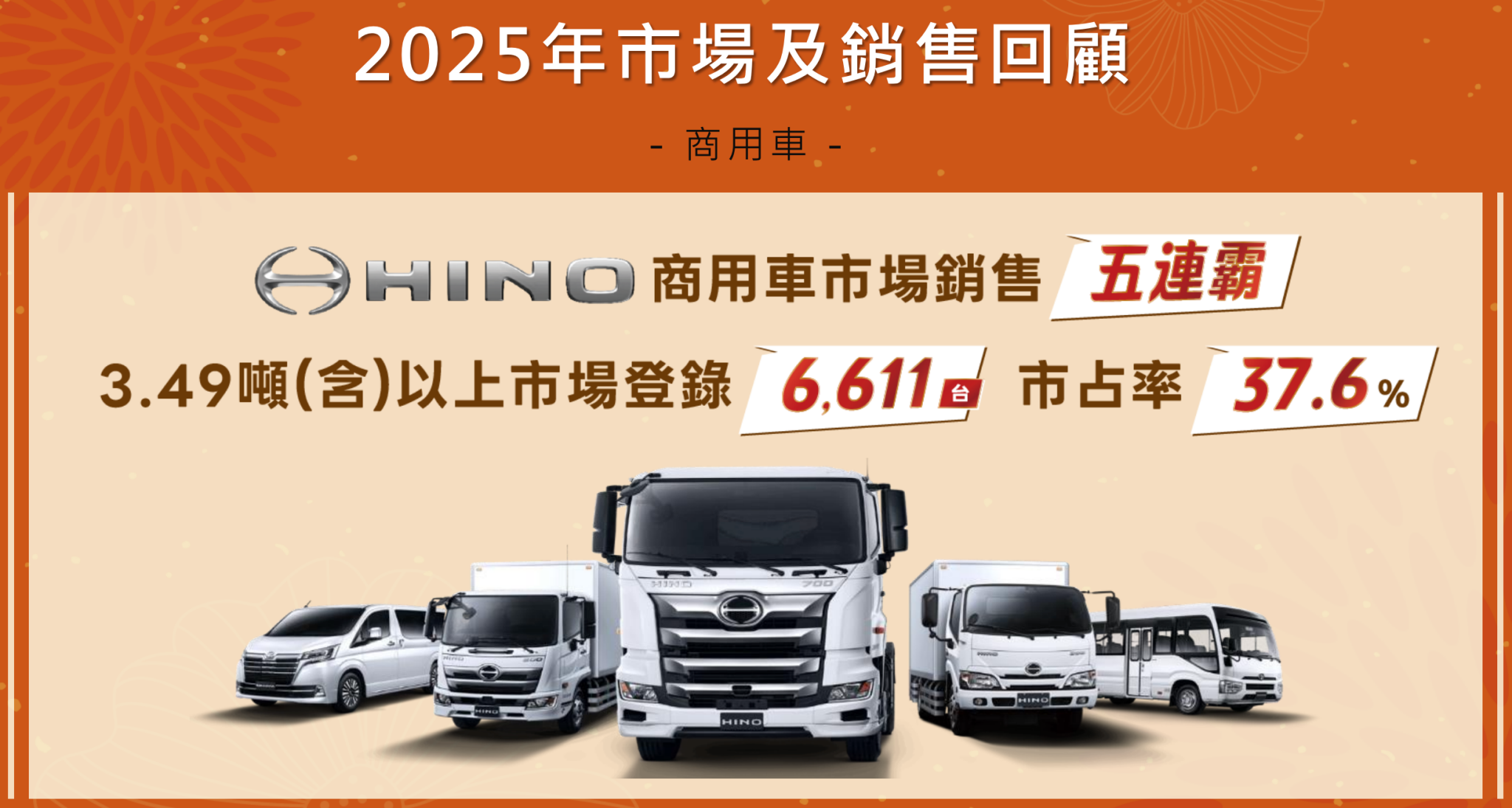 和泰旗下三品牌在 2025 年展現強大產品力:TOYOTA:年度銷售冠軍 COROLLA CROSS 登錄逾 4.4 萬台,刷新歷史新高 。Lexus:穩坐豪華車市場三連霸,RX、UX、LM 紛紛於各級距奪冠 。商用車:HINO 蟬聯 3.49 噸以上商用車銷售五連霸,市佔高達 37.6% 。