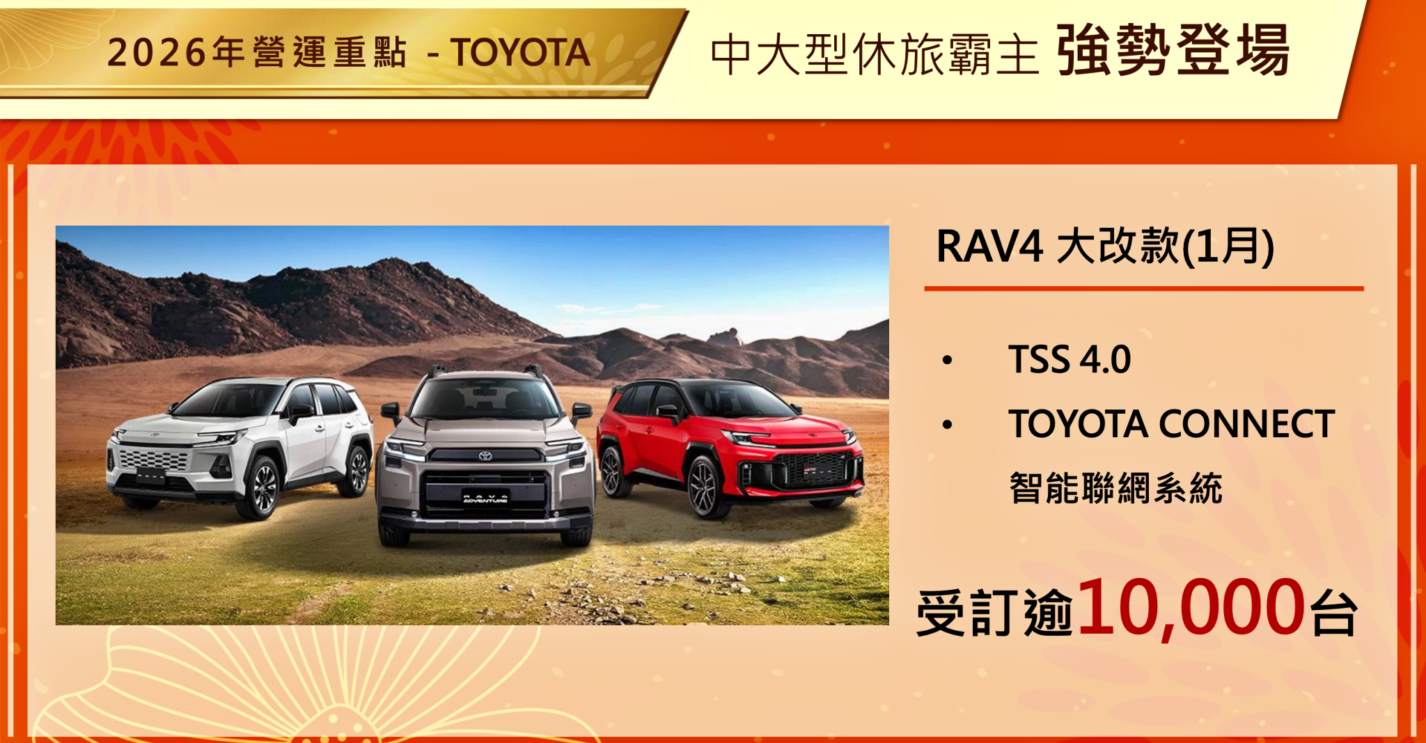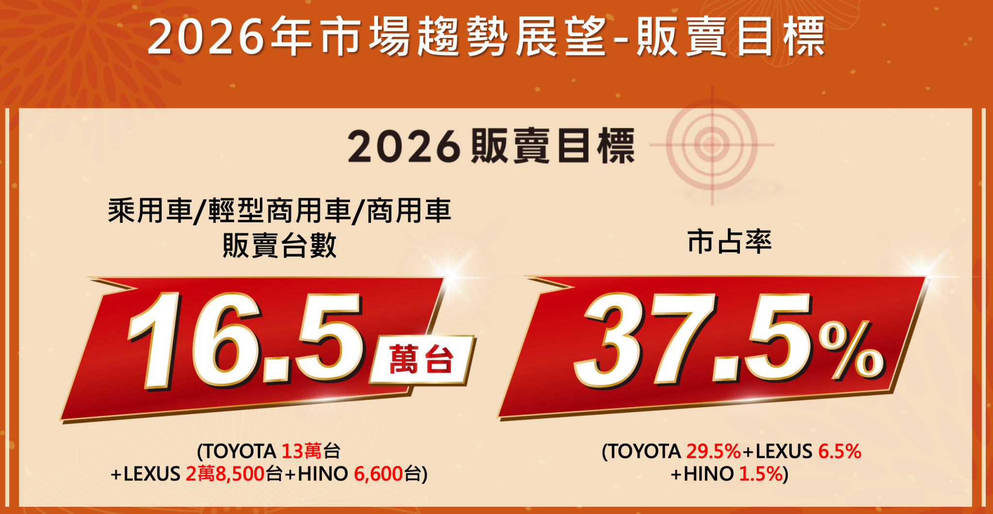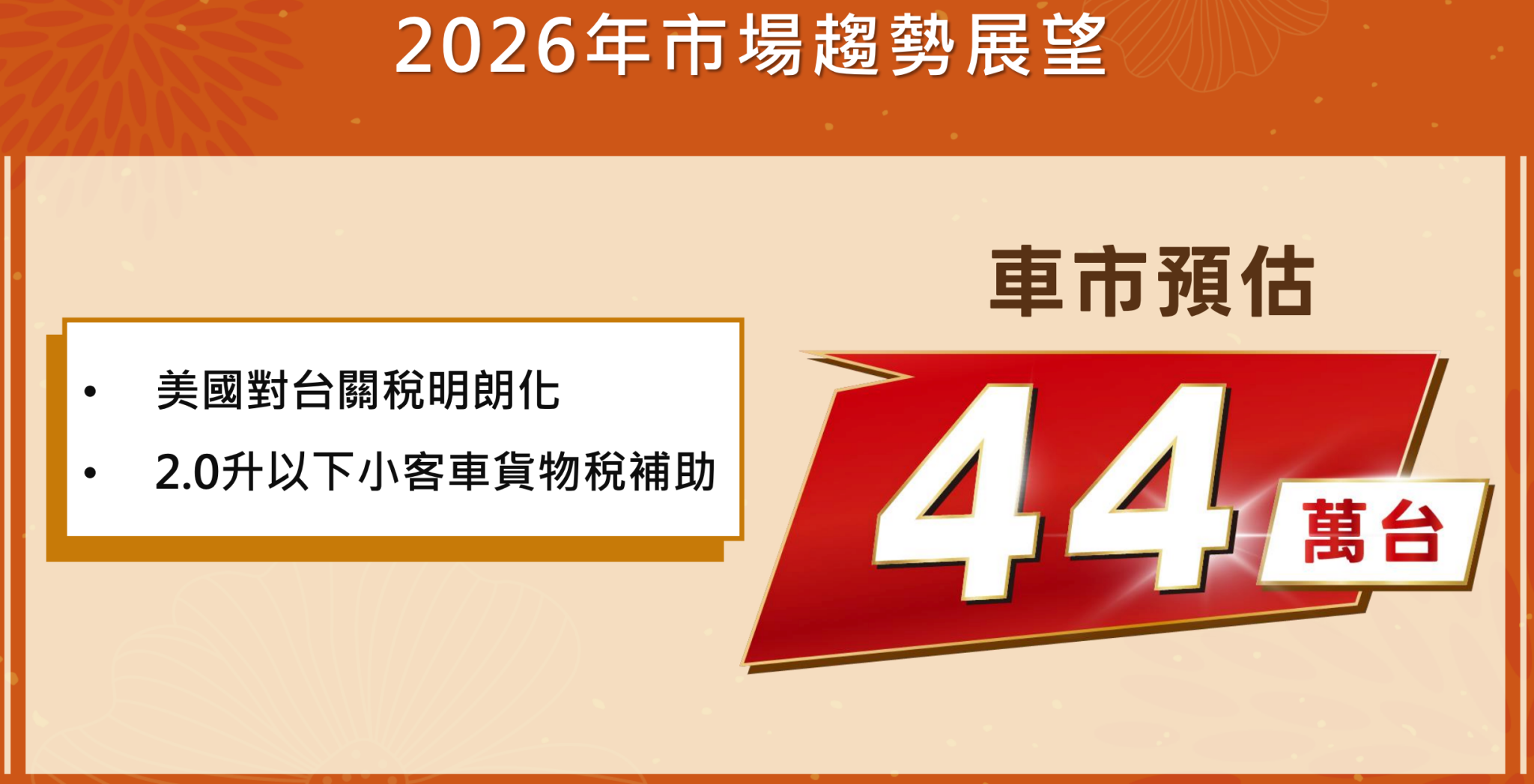 2026年受惠於美國對台關稅政策明朗化,加上新購車貨物稅減徵,市場有望回復到44萬台水準。和泰三品牌將挑戰合計16.5萬台、市佔率37.5%的銷售目標。