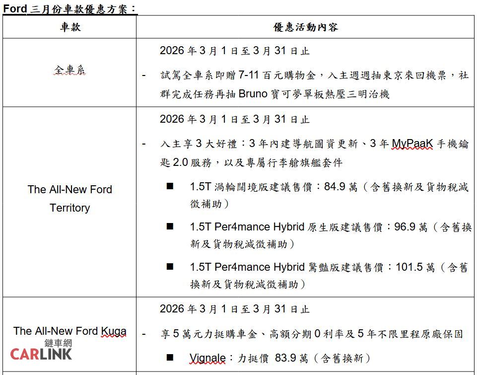 入主The All-New Ford Territory享優惠價84.9萬起(含舊換新及貨物稅減徵補助),再加碼三大購車禮遇:3年內建導航圖資更新、3年MyPaaK手機鑰匙2.0服務,以及專屬行李艙旗艦套件;入主The All-New Ford Kuga 1.5T享力挺價83.9萬(含舊換新),內含5萬元力挺購車金〔註二〕、高額分期0利率及5年原廠保固〔註三〕。即刻蒞臨賞車,把握春日良機開啟美好旅程,將東京機票與多重好禮帶回家!