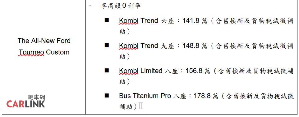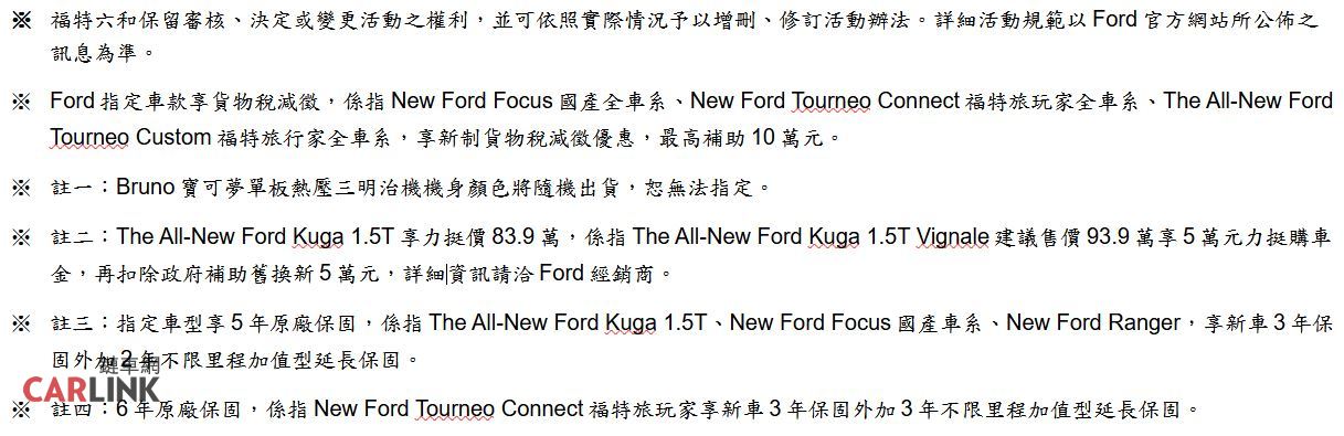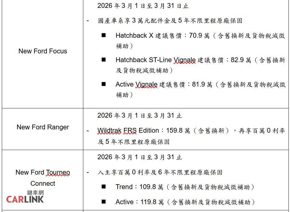 歐洲超能智駕跑旅The All-New Ford Kuga採用1.5T EcoBoost®渦輪增壓汽油引擎,經專屬調校可輸出187ps的強勁動力,動力與操控完美融合,帶來前所未有的駕馭快感,入主即享力挺價83.9萬(含舊換新),再加碼高額分期0利率及5年原廠保固;New Ford Ranger Wildtrak FRS Edition搭載Advanced 4WD智慧四輪驅動系統,可精準判斷全地形路況,智慧調節動力輸出,輕鬆征服各種險峻地形,入主享159.8萬(含舊換新)、百萬0利率及5年原廠保固;New Ford Focus提供多款車型選擇,搭配德規精準底盤調校,帶來靈活操控感受,入主享貨物稅優惠價70.9萬起,再加碼3萬元配件金及5年原廠保固;歐洲進口正七人座New Ford Tourneo Connect福特旅玩家,享貨物稅優惠價109.8萬起,加碼提供百萬0利率及6年不限里程原廠保固〔註四〕;歐洲首選國際商旅The All-New Ford Tourneo Custom福特旅行家,享貨物稅優惠價141.8萬元起,入主再享高額0利率。全方位陣容一次到位,無論是熱血自駕或商務出行,皆能滿足您的多元移動渴望。