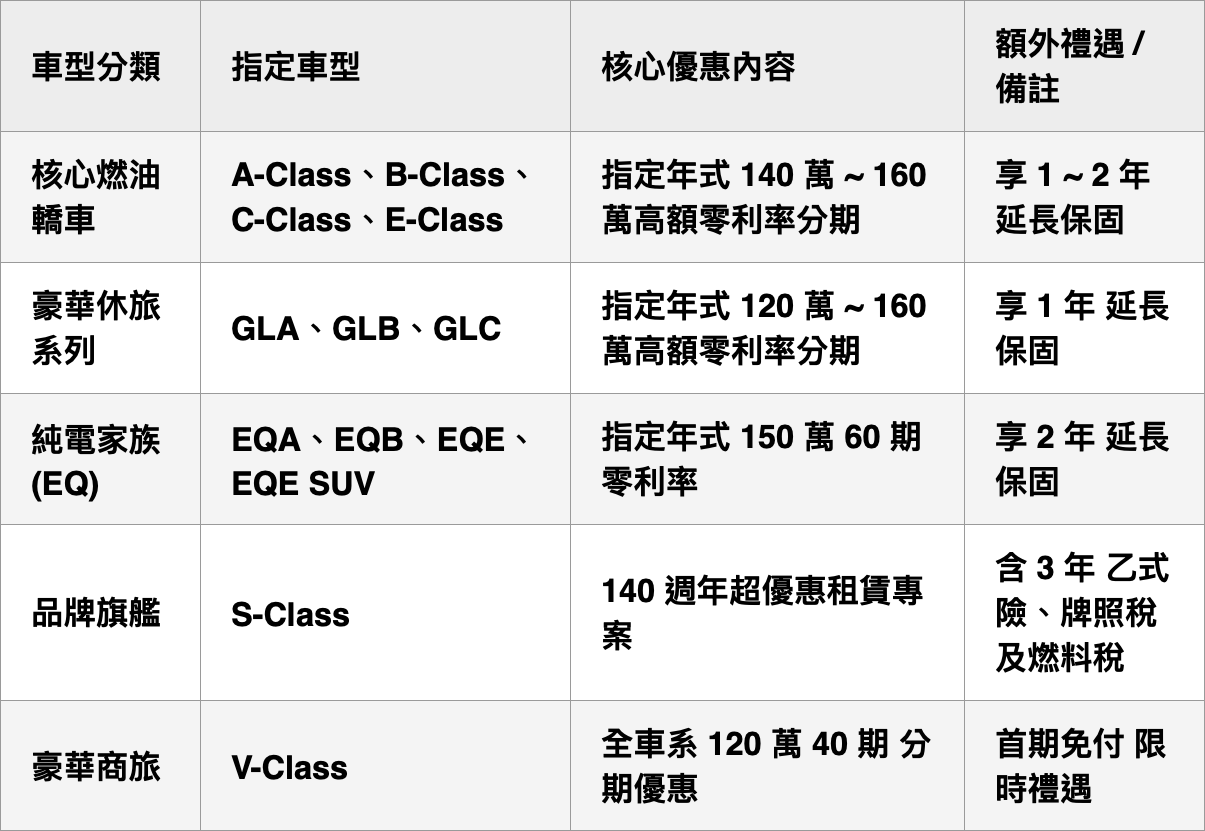 除了針對多款核心燃油車型與純電家族推出高額零利率、延長保固與保險支援等優惠,為慶祝 Mercedes-Benz 汽車發明邁入 140 週年的輝煌里程,更為旗艦 S-Class 打造前所未有的超優惠租賃專案,將持車細節與財務規劃完美整合。此外,豪華商旅 V-Class 則以首期免付優惠,邀請品味人士輕鬆入主,擁抱星級生活。