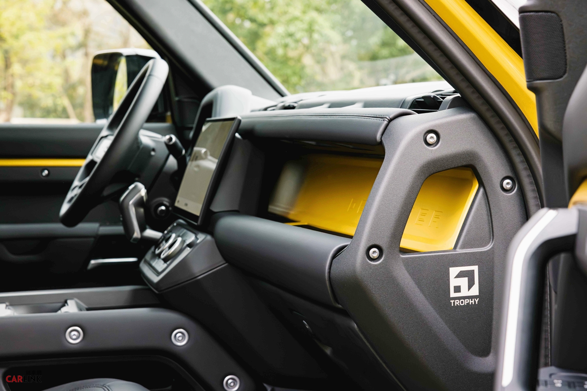 車室內裝採用 Trophy 發光車門踏板專屬識別營造賽事主題氛圍,質感出眾的檀木黑溫莎皮革座椅讓強悍風格更顯奢華,外露式儀錶板橫樑則施以車身同色塗裝,並搭配獨特的 Trophy 雷射蝕刻徽飾。專屬 Trophy 套件包含能提高車輛乘載量的遠征車頂架,搭配方便取放車頂物品的黑色展開式車頂梯,能讓滿載裝備的旅程擁有額外的儲物空間;車側亮澤黑外部側掛式裝備箱則能為泥濘、潮濕或沾滿沙土的物品提供額外存放空間;前後輪皆裝配經典擋泥板,以及用於過濾灰塵的加高空氣吸入孔,實現極致的越野性能。