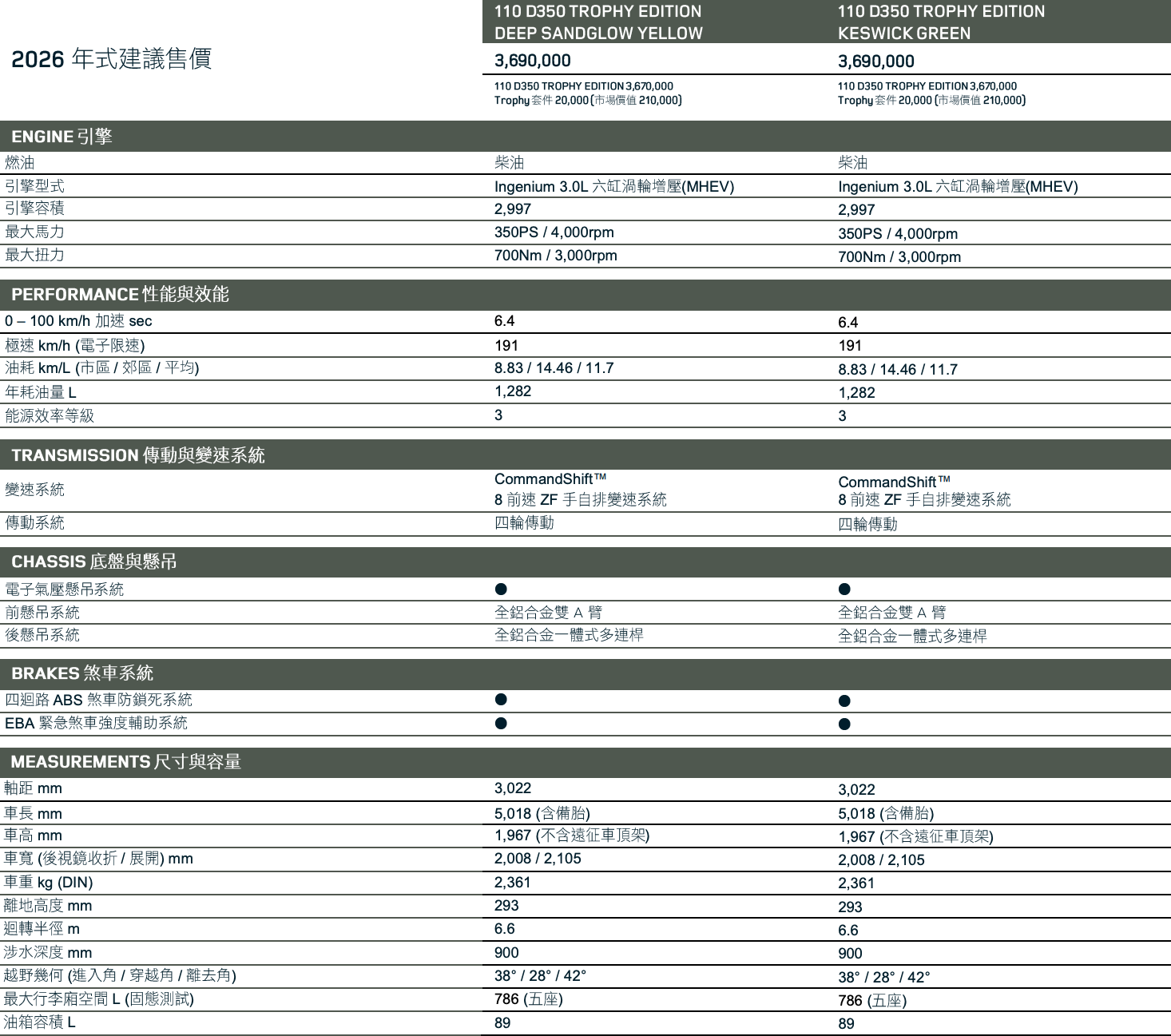 動力核心搭載 Ingenium 3.0L 直列六缸渦輪增壓 MHEV 柴油引擎,具備 350PS 馬力與 700Nm 最高扭力;配備電子氣壓式懸吊系統,最大化車輛全地形穿越能力,涉水能力最高可達 900mm,結合 Defender 一系列先進的駕馭科技配備,從容征服各種來自天候及地形的艱難挑戰。全新 26 年式 Defender Trophy Edition 限定版透過專屬主題與套件,展現勢不可擋的探險精神,全台限量 50 席次,建議售價 369 萬元起。