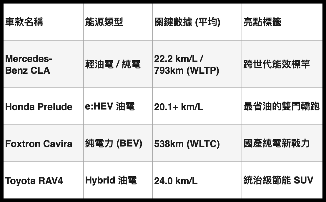 從這份清單可以看出,2026 年是 「20 km/L 俱樂部」 正式普及的一年。過去 20 km/L 是小車的專利,現在連豪華房車與中型休旅都能輕鬆達標。此外,WLTC 測試標準已全面取代舊有的 NEDC,這代表現在看到的數據更具真實參考價值。