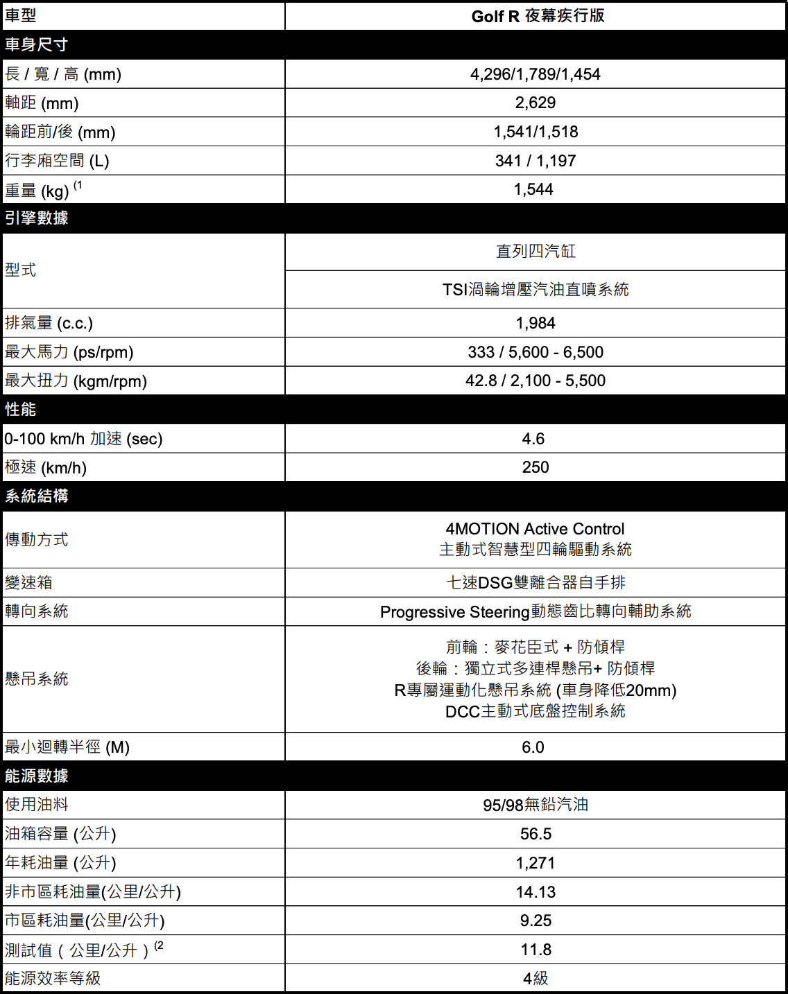 - 除高辨識度和獨樹一幟內外觀設計,The new Golf R 夜幕疾行版以最大馬力333 ps、最大扭力42.8 kgm的頂尖動力,與同級第一4.6秒零百加速,讓車迷無畏享受每趟超越自我的激昂挑戰。