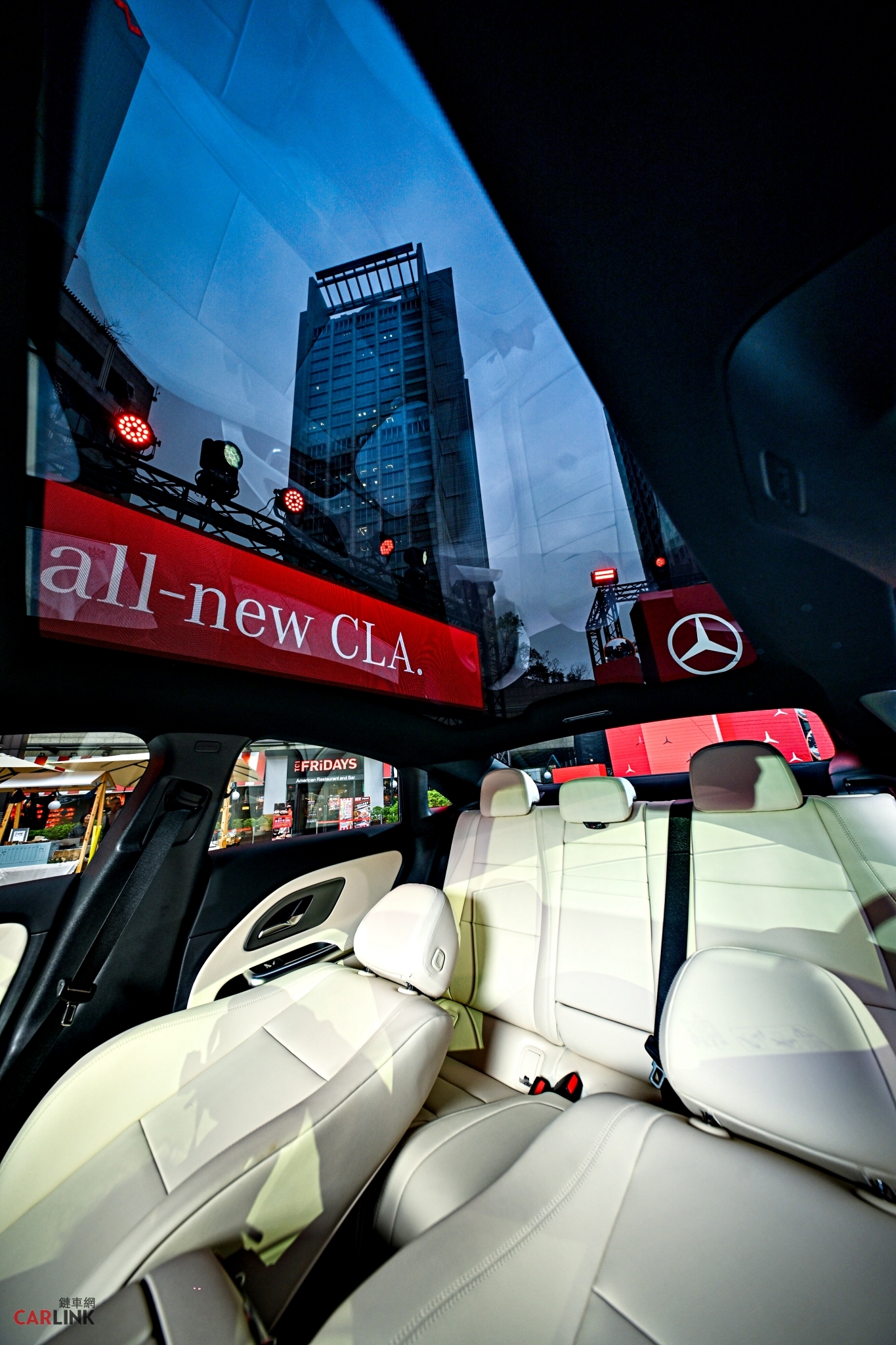 在設計美感之外,全新 CLA 車輛風阻係數低至 Cd 0.21。此外,全車系標配全景式玻璃車頂,自前擋風玻璃一路延伸至車尾,大幅提升車室的頭部空間與採光效果,高效抗UV與隔熱科技,有效阻擋紫外線並降低車內熱能累積,在享受城市天際線與夜空星光的同時,亦兼顧乘坐舒適與防護表現。整體而言,全新 CLA 以前衛的設計語言與鮮明的光型識別,塑造出極具存在感的車身輪廓。銳利的車頭、流暢的側面比例與極具辨識度的車尾光型,共同構成一款令人一眼難忘的新世代 Mercedes-Benz 轎車。簡單說 : 帥,直接封印在腦袋。