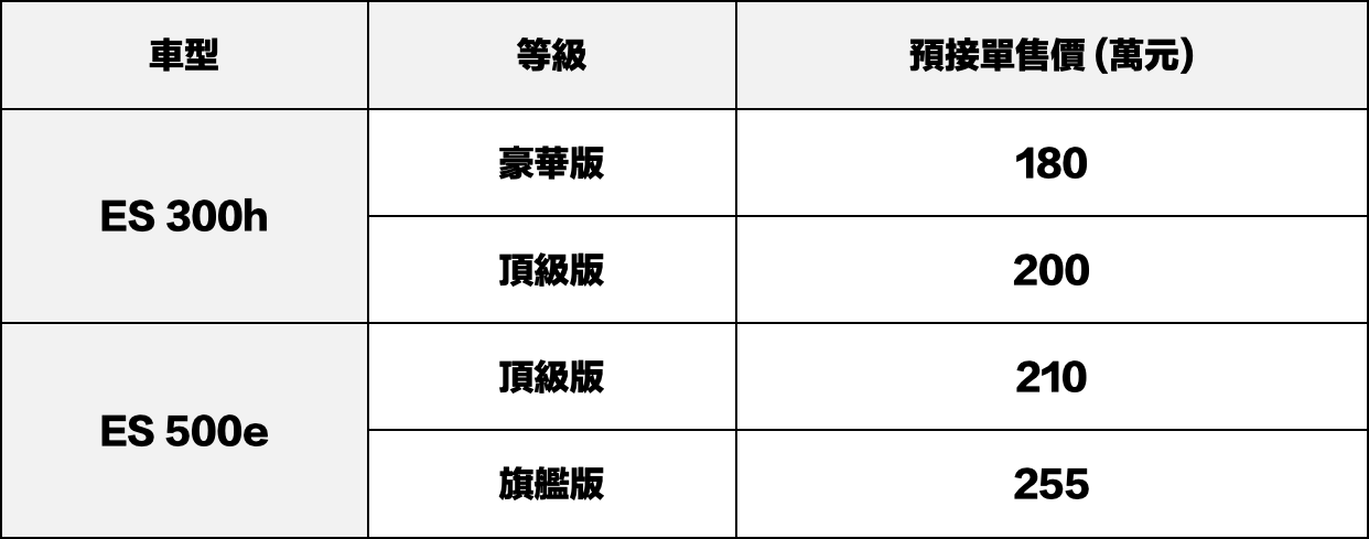 全新ES於台灣市場導入ES 300h與ES 500e雙動力編成,其中ES 300h採用2.0升油電複合動力系統;ES 500e則為搭載DIRECT4電子式四輪傳動系統的純電車型,提供消費者不同使用情境的豪華移動方案。