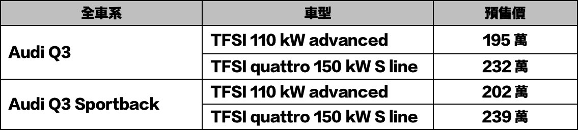 全車系Audi Q3預售價195萬元起,欲知更多Audi Q3 車系產品資訊與預售訊息,請洽全台 Audi 授權展示中心或造訪 Audi Taiwan 官方網站與社群平台,掌握品牌最新動態。