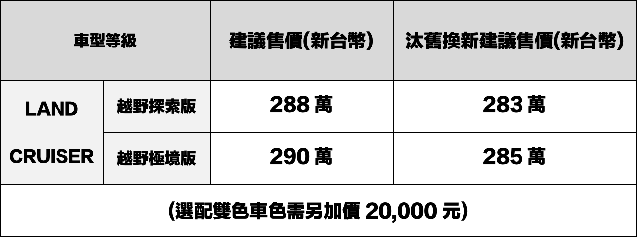 LAND CRUISER延續高品質、耐用可靠的造車理念,打造出越野玩家專屬多元變化座艙,兼具日常實用性與戶外越野機能,展現出真正能滿足多元生活型態的全方位越野座駕。為了符合台灣市場的熱烈迴響,和泰汽車將持續與TOYOTA日本原廠積極爭取配額,誠摯邀請消費者親臨展間,實際了解LAND CRUISER的無畏魅力:https://www.toyota.com.tw/showroom/LANDCRUISER/