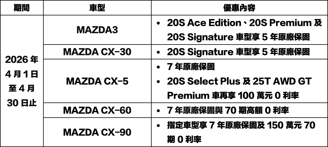 +2026年4月MAZDA購車優惠專案